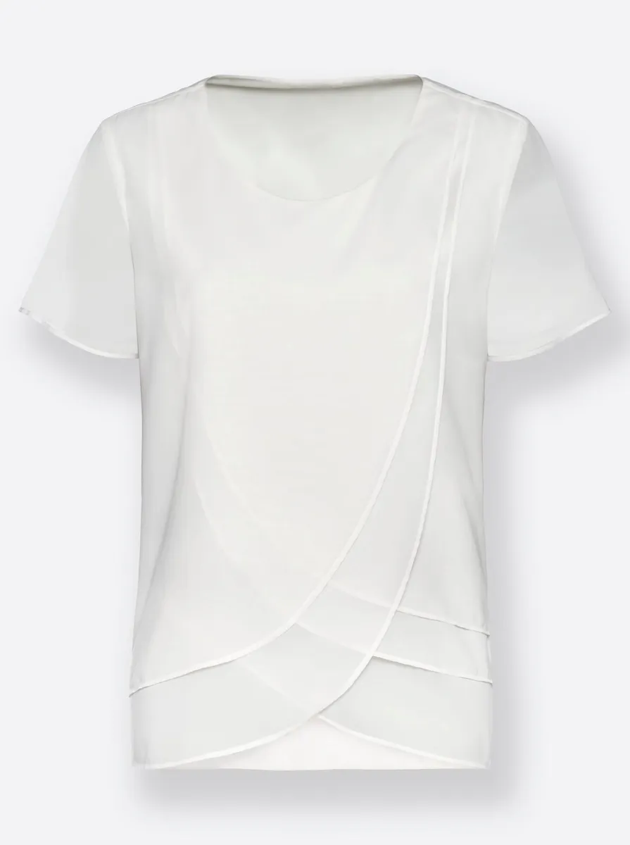 Такая красивая и женственная: блузка из неприхотливого в уходе жоржета. Закругленные слои спереди разной длины создают привлекательный и прекрасно скрытый вид. Двухслойная спинка заканчивается прямым подолом. С круглым вырезом, чуть шире, короткими рукавами и вытачками на груди. 100% полиэстер. Машинная стирка.
