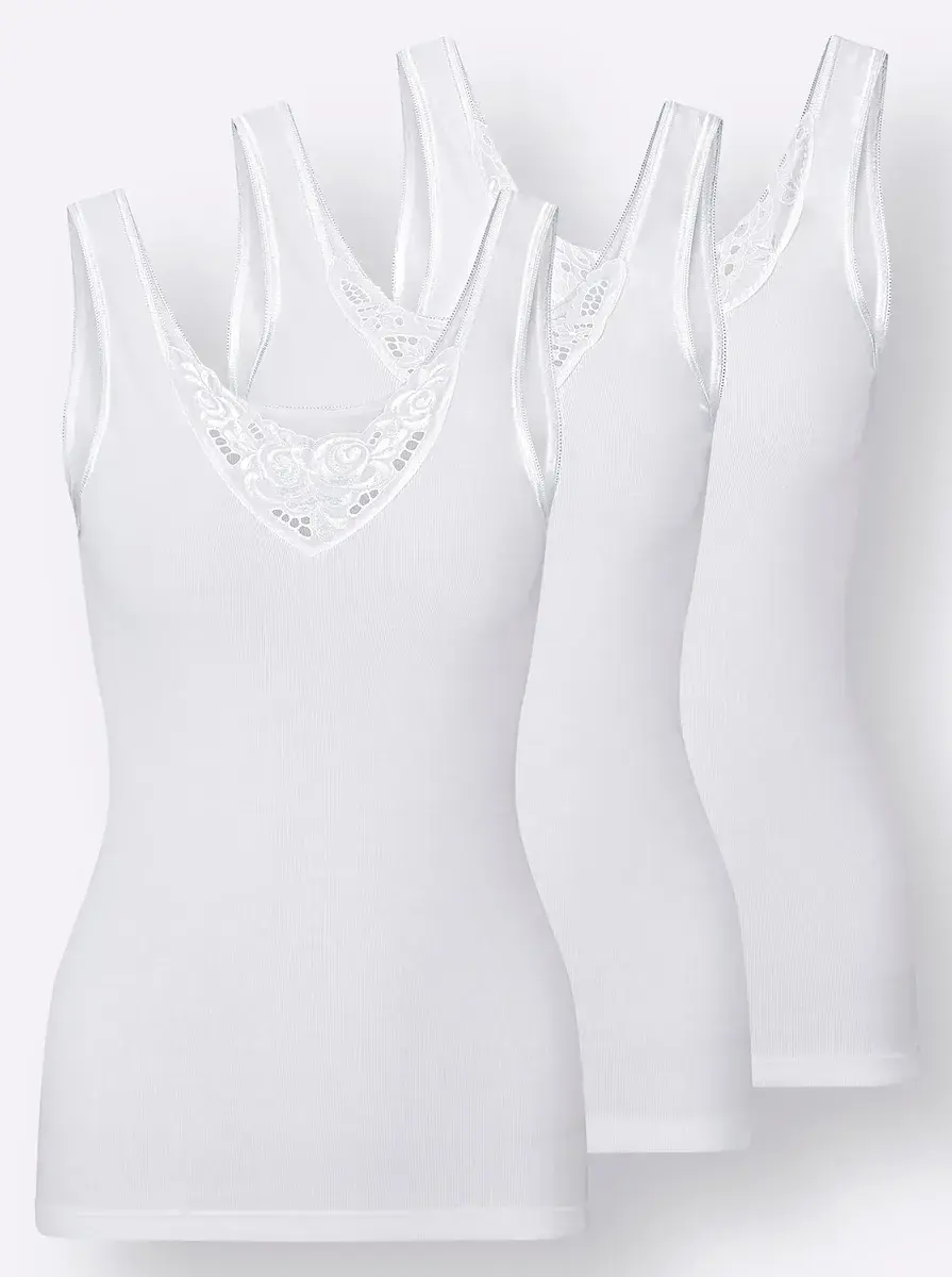 Рубашка подмышки от кон-та. В доступной упаковке по 3 штуки с 3 разными узорами из батистового кружева в зоне декольте. Тонкое ребро. 100% хлопок.