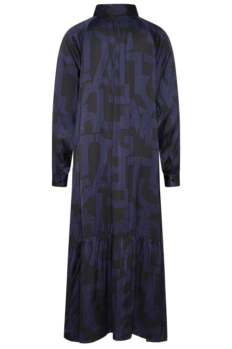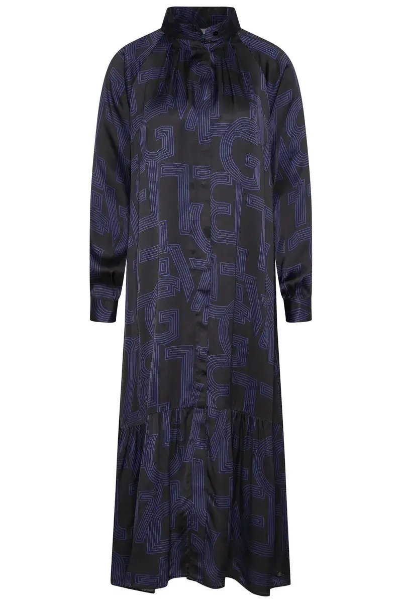 Платье-блузка изготовлено из 100% струящейся и мягкой вискозы. Графические принты и современный воротник-стойка бросаются в глаза. Платье с воланами имеет планку на потайных пуговицах и женственные рюши в области плеч и на манжетах рукавов.