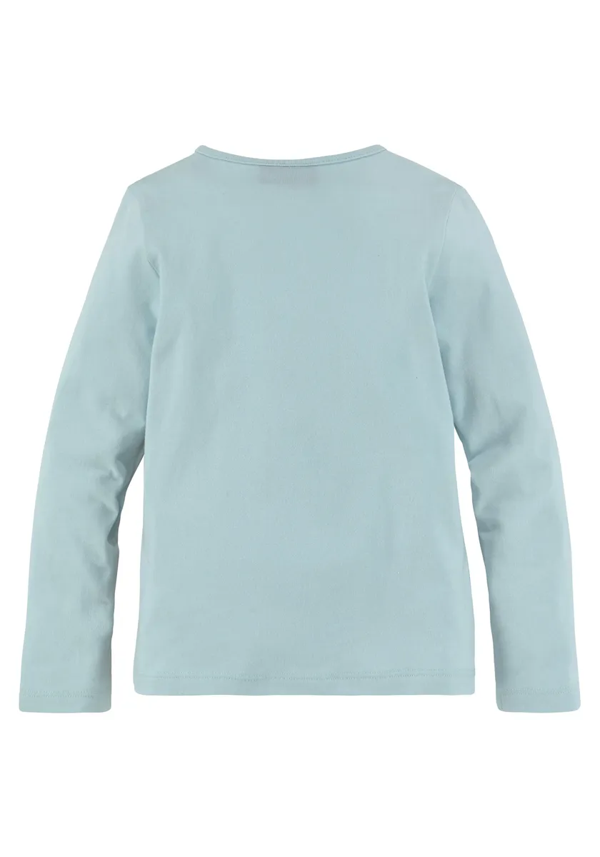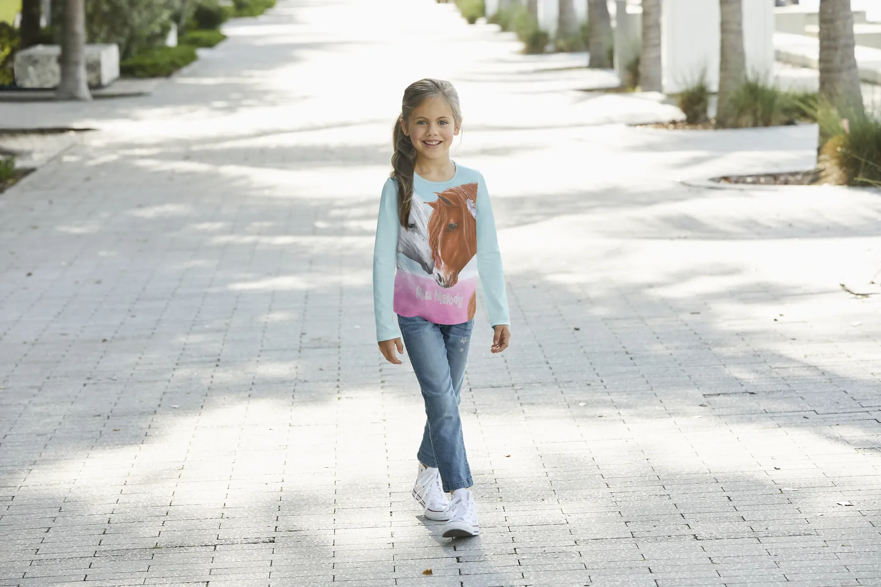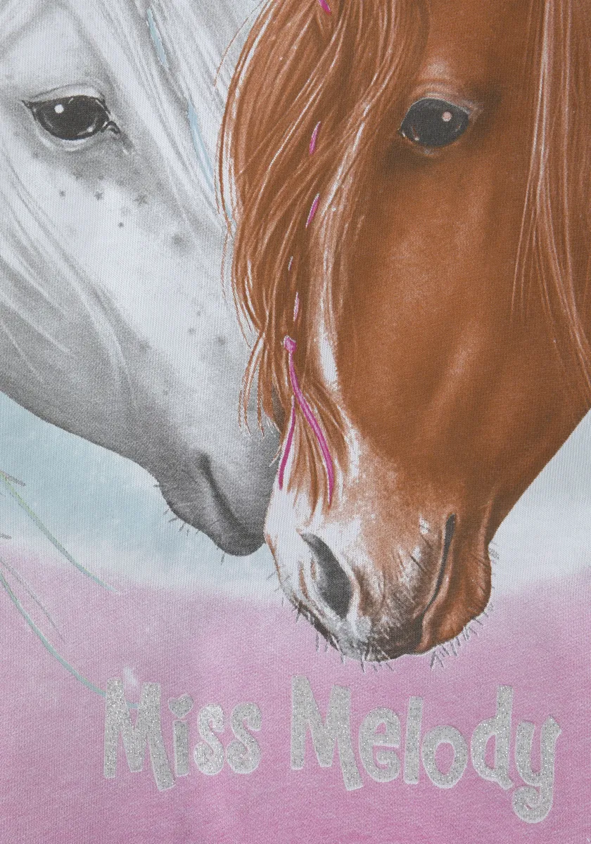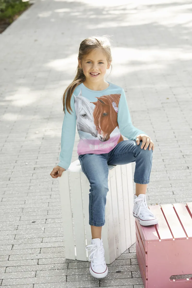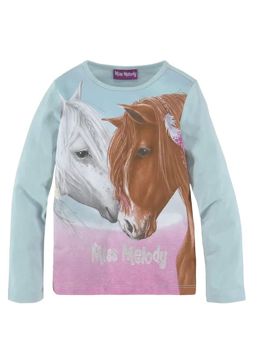 Рубашка с длинными рукавами от Miss Melody для девочек с лошадиным принтом и маленькой блестящей надписью спереди. Удобная базовая модель с круглым вырезом. Высокий комфорт при ношении благодаря мягкому качеству трикотажа.