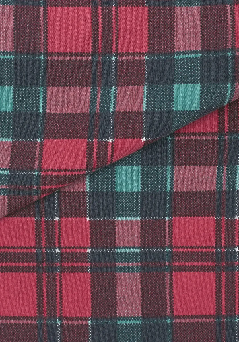 Рубашка с коротким рукавом и V-образным вырезом. Шорты с принтом в клетку и эластичным поясом. Изготовлен из мягкого одинарного трикотажа из 100% хлопка.