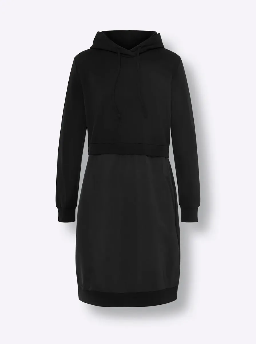 Платье-рубашка изготовлено из смеси пота и тканого материала. Модный повседневный стиль с капюшоном и кулиской. Длинные рукава и манжеты по краю. С карманами. Поддержите инициативу «Хлопок, сделанный в Африке». 95% хлопок, 5% эластан. Ткань: 100% полиэстер. Машинная стирка.