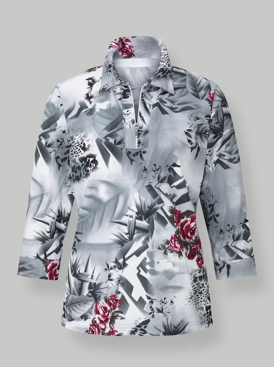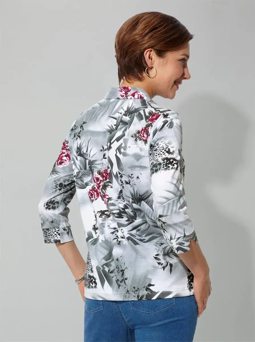 Рубашка с красивыми стразами по углам воротника и на короткой молнии. Экстравагантный принт, сочетающий имитацию меха животных и цветочный узор. Рукава 3/4 с разрезом. 100% хлопок. Машинная стирка.