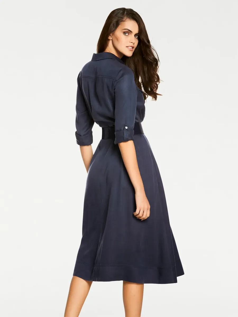 Платье-рубашка с завязывающимся поясом. Струящаяся драпировка, ощущение прохлады, устойчивость к морщинам. Облегающий верх, расклешенная юбка. Подходит для повседневного использования и офиса. Рукава можно подвернуть и закрепить планкой. Длина около 114 см. 100% лиоцелл. Машинная стирка.
