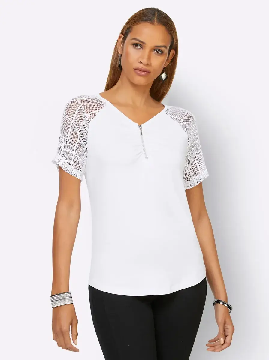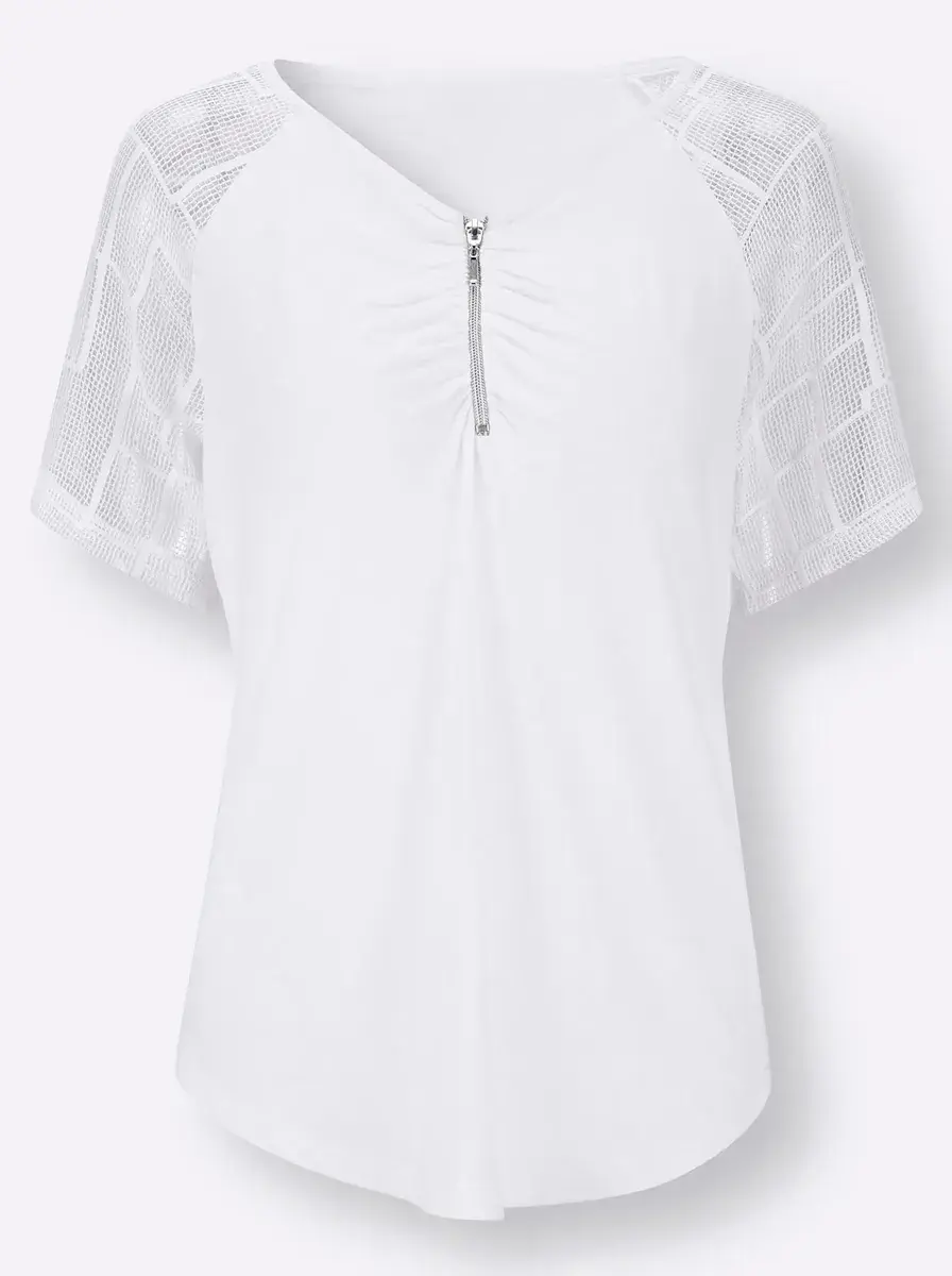 Рубашка с кружевом в современном графическом стиле на плечах и короткими рукавами. V-образный вырез переходит в молнию с красивыми оборками. Красиво закругленный край. 95% вискоза, 5% эластан. Кружево: 100% полиэстер. Машинная стирка.