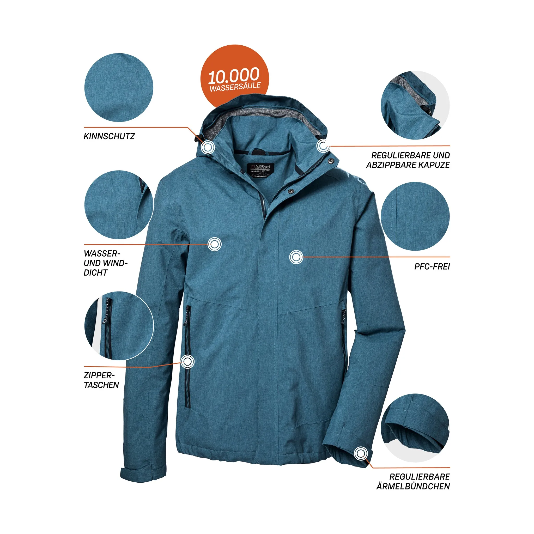 Мужская функциональная куртка killtec надежно защищает от влаги и ветра благодаря ветрозащитному и водонепроницаемому наружному материалу и сварным швам. В то же время куртка дышащая. Внутри есть два закрывающихся кармана. Капюшон регулируется по ширине и длине и при необходимости снимается. Потайная молния имеет практичную защиту подбородка. Манжеты и подол регулируются индивидуально. Благодаря классическому, неподвластному времени дизайну мужская куртка станет идеальным спутником не только для активного отдыха, но и в повседневной жизни. Для killtec особенно важно сделать коллекции более устойчивыми и ориентированными на будущее. killtec все больше полагается на более ответственные производственные процессы. Поэтому эта куртка была пропитана веществами, не содержащими фтора.