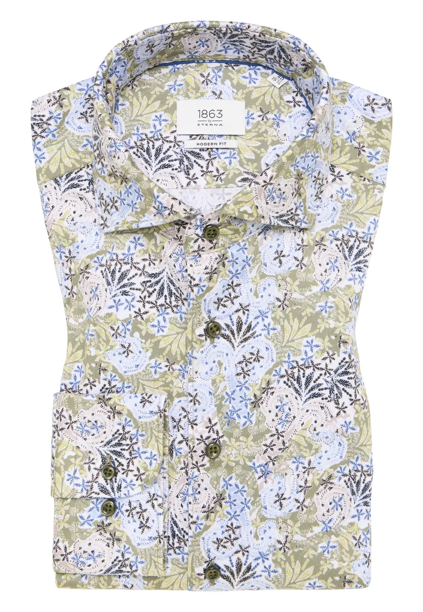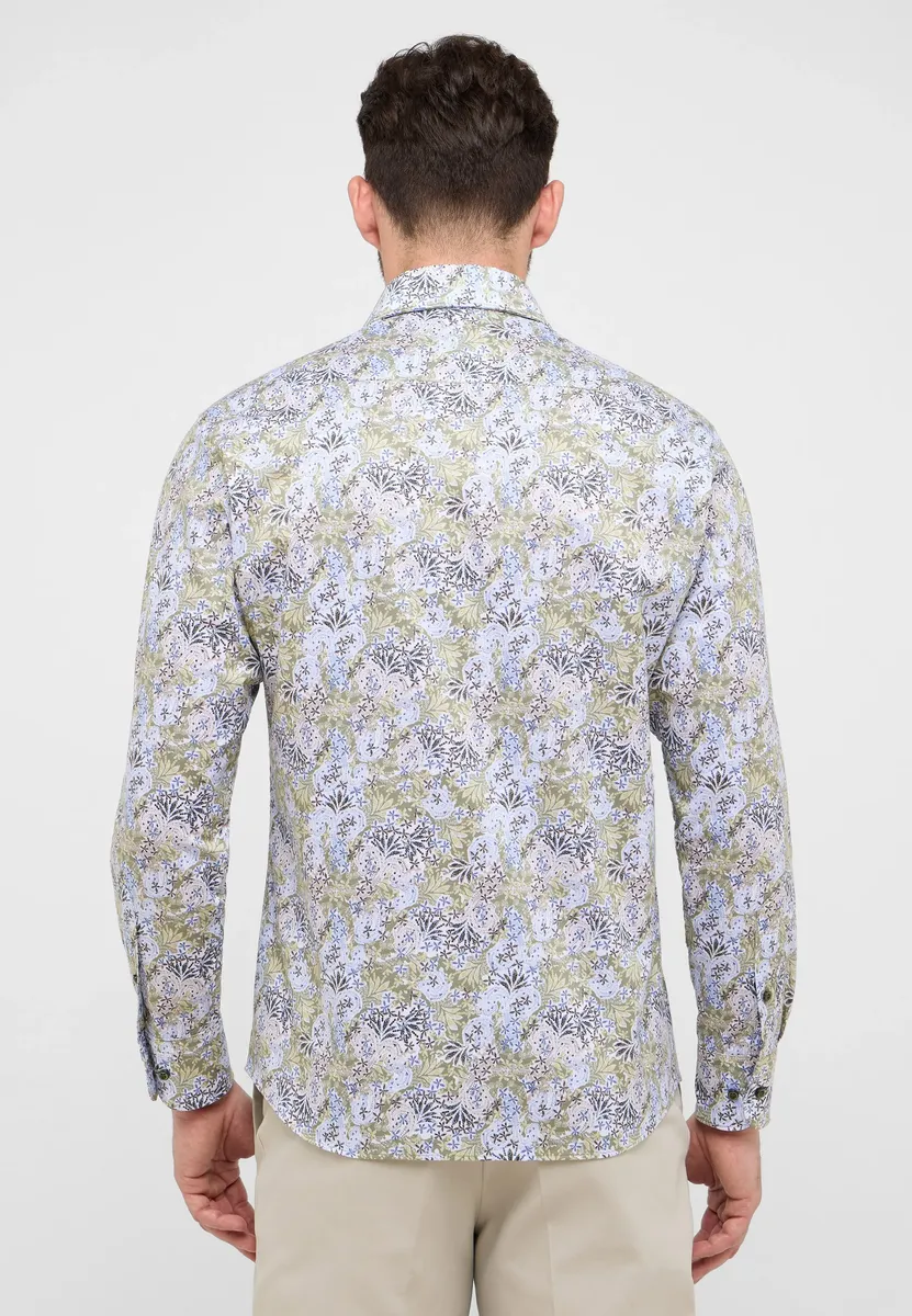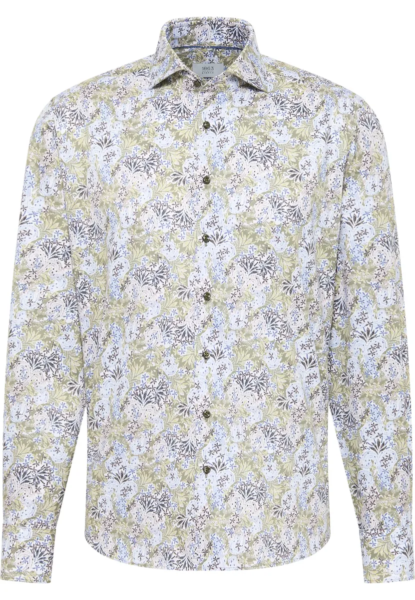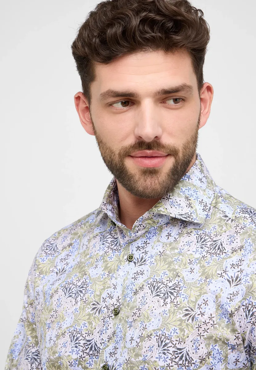Рубашка с принтом и цветочным узором создает модный весенний образ. Носящееся поверх пояса, оно подчеркивает повседневный стиль. Оно изготовлено из высококачественного хлопка (саржа, легко гладится) и имеет модный крой. Подходит тем, кто хочет интерпретировать классический образ более модно. Подол закруглен и укорочен. Закажите эту великолепную рубашку MODERN FIT с длинными рукавами и воротником акулы из нашей премиальной линии 1863 от ETERNA онлайн сегодня!