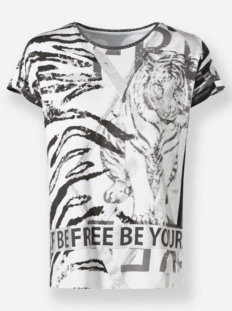Рубашка с принтом Чрезвычайно привлекательна. Идеальное сочетание: фантазийная пряжа на круглом вырезе, графические принты с мерцающими акцентами и надписью. С декоративными бретелями на коротких рукавах внахлест. 95% вискоза, 5% эластан. Машинная стирка.