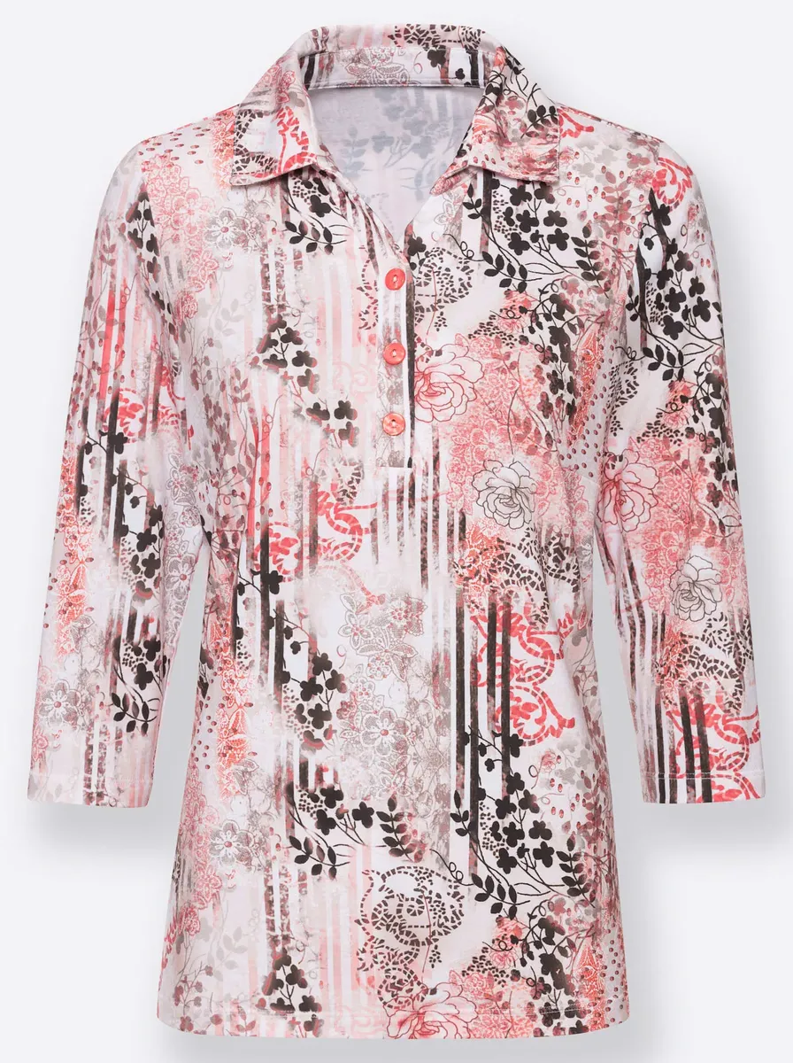 Рубашка с цветочным принтом и открытым воротником-поло. Удобные вытачки для груди. Рукава 3/4. Одинарный трикотаж. 92% полиэстер, 8% эластан. Машинная стирка.