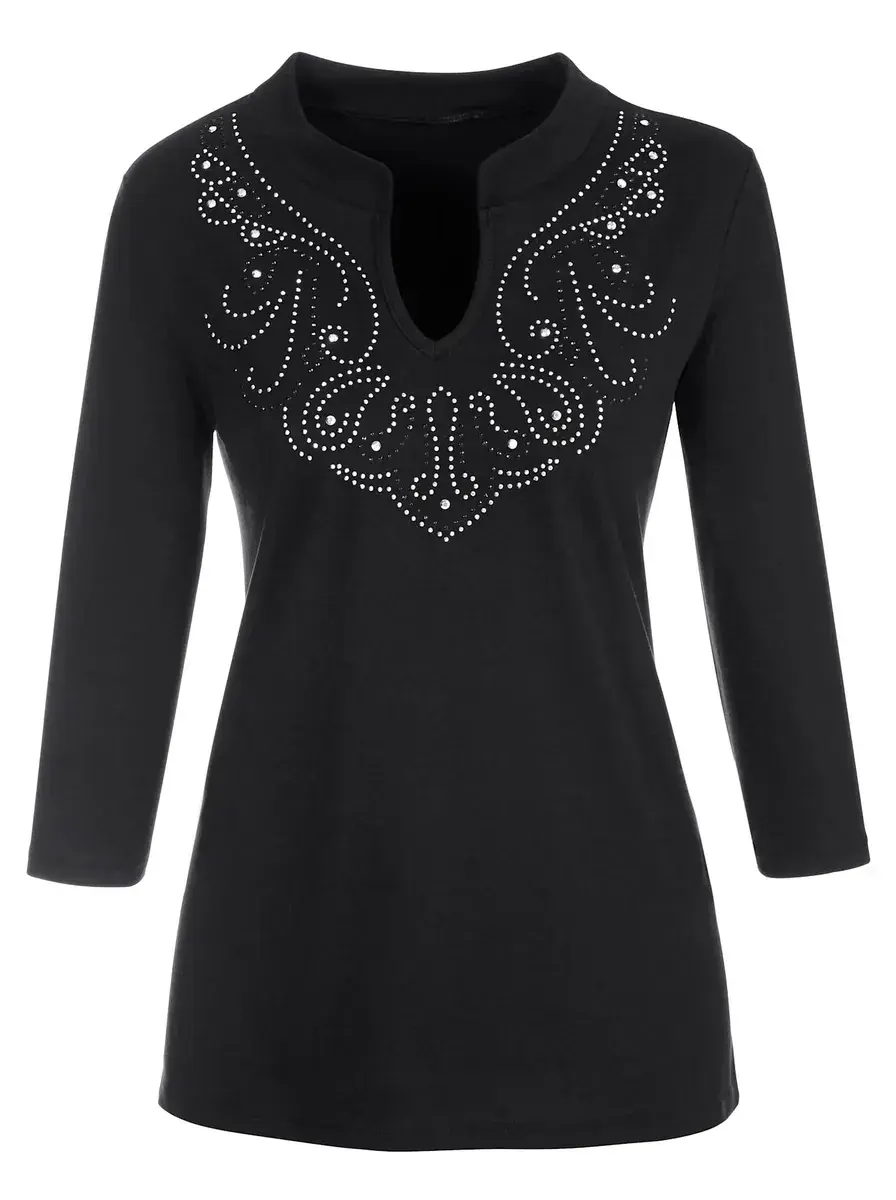 Рубашка с эффектной гарантией: вырез с маленькой буквой V обрамлен многочисленными искусно расположенными стразами. С рукавом 3/4. 100% хлопок. Машинная стирка.