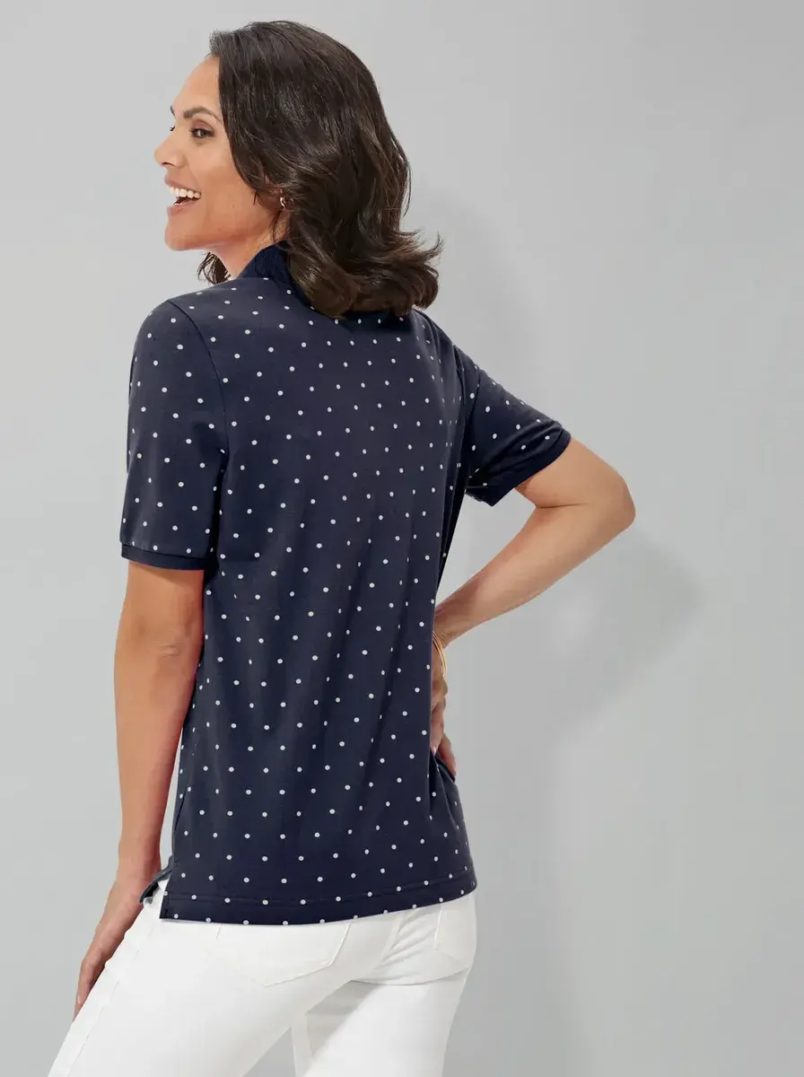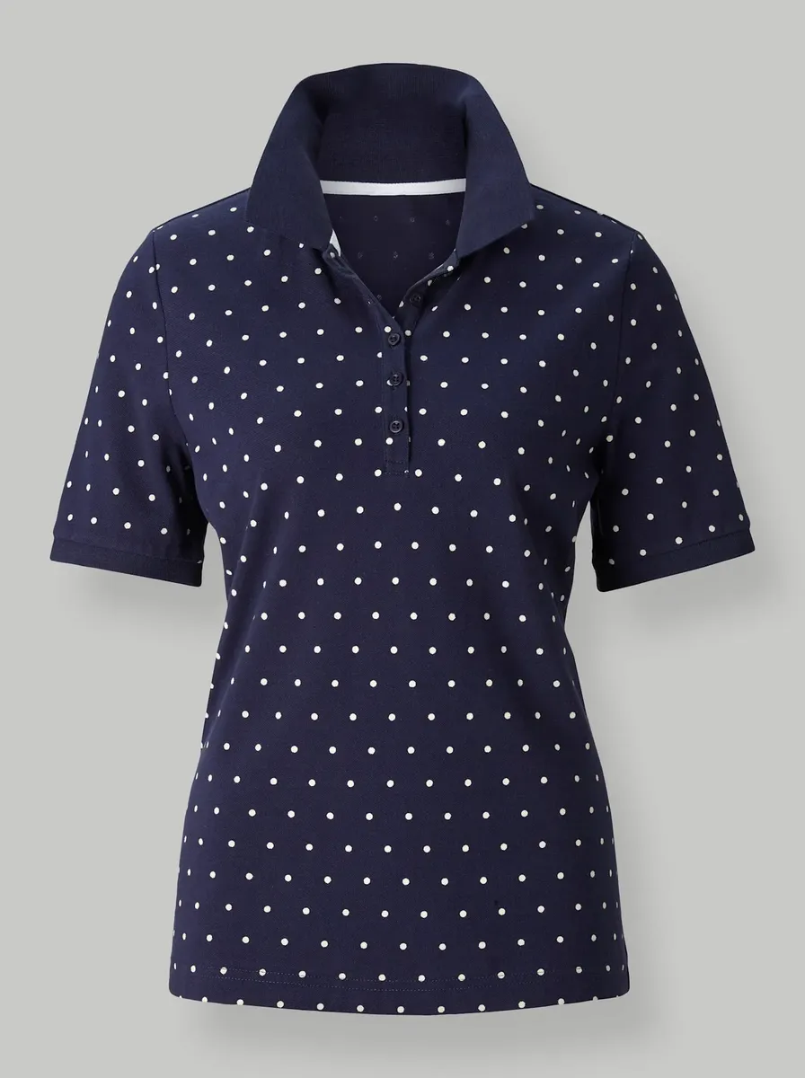 Рубашка-поло в непринужденный дизайн в горошек. С воротником-поло, короткой планкой на пуговицах и боковыми разрезами. Качество легкое пике. 100% хлопок. Цвет пестрый серо-пятнистый: 88% хлопок, 12% полиэстер. Машинная стирка.