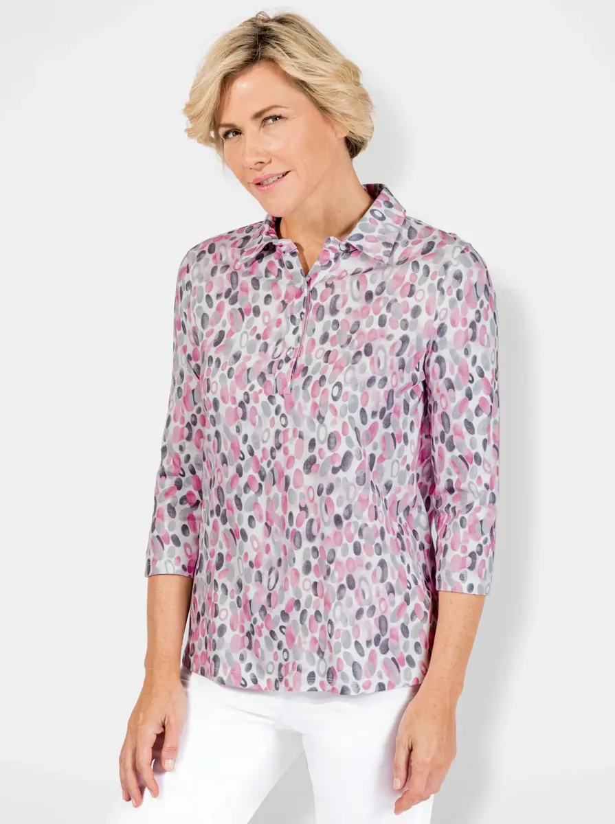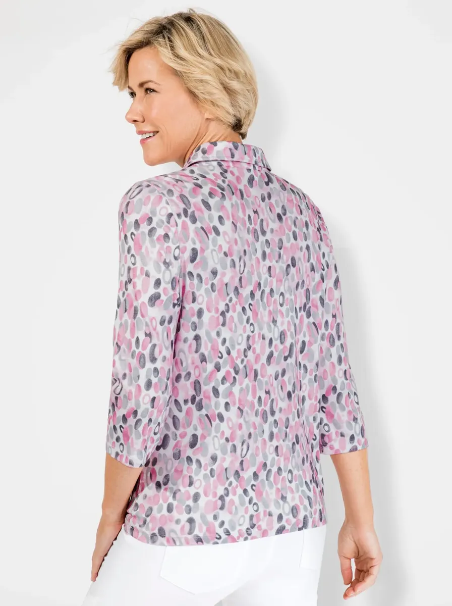 Рубашка-поло с оригинальным принтом из мягкой смеси модала и хлопка, сертифицированного OCS. Открытый воротник рубашки и рукава 3/4. Одинарный трикотаж. 50% хлопок (OCS), 50% модал. Машинная стирка.