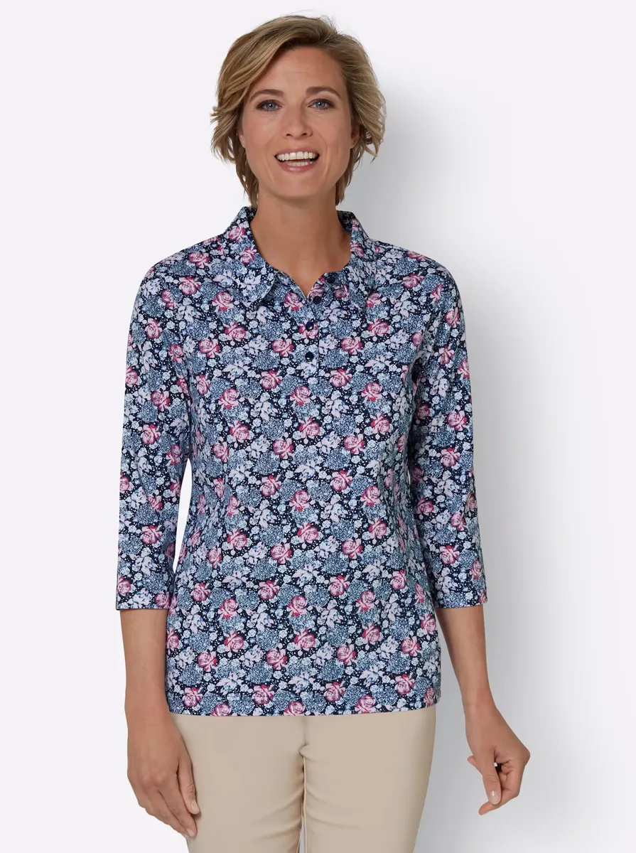 Рубашка-поло с цветочным узором, вдохновленная природой. С воротником-поло, короткой планкой на пуговицах и рукавами длиной 3/4. 100% хлопок. Машинная стирка.