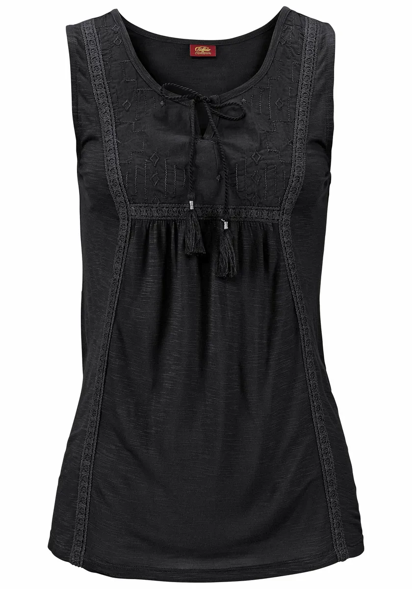 Пляжный топ от BUFFALO. С вышивкой в ​​тон на груди. Вырез с завязками и кисточками. Тонко структурированное качество, изготовлено из 100% вискозы. Вставка: 100% хлопок.