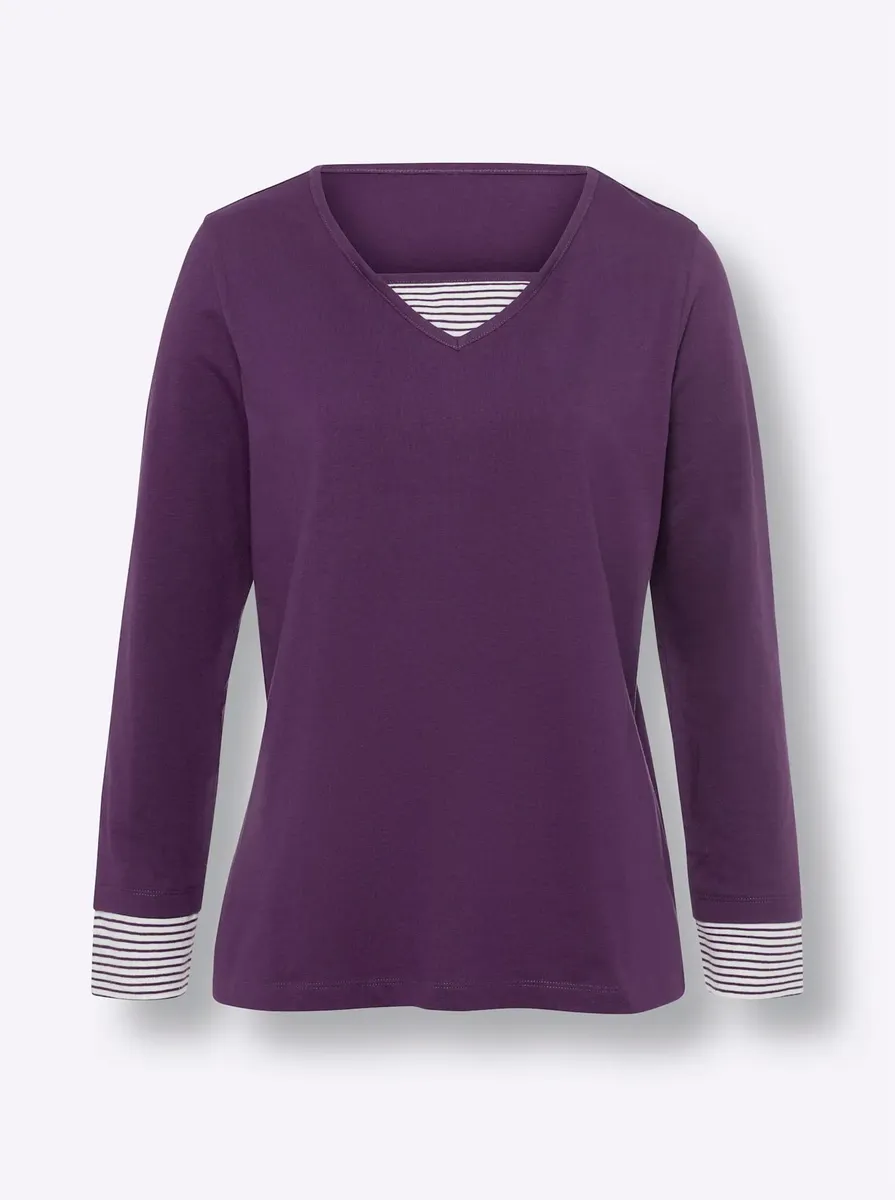 Повседневная рубашка в популярном многослойном исполнении. Полосатая вставка на V-образном вырезе и рукавах окрашена в высококачественную пряжу. 100% хлопок. Машинная стирка.