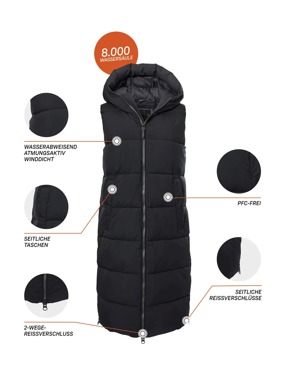 С длинным функциональным стеганым жилетом с большим капюшоном от G.I.G.A. DX, ты в тренде. Он водоотталкивающий, ветрозащитный и в то же время дышащий. Два боковых кармана и один внутренний карман вмещают мобильные телефоны, ключи и т. д. Двусторонняя молния и две боковые молнии обеспечивают свободу движений. Передняя молния также имеет практичную защиту подбородка. Для killtec особенно важно сделать коллекции более устойчивыми и ориентированными на будущее. killtec все больше полагается на более ответственные производственные процессы. Поэтому этот жилет пропитан веществами, не содержащими фтора, и частично изготовлен из переработанного материала.