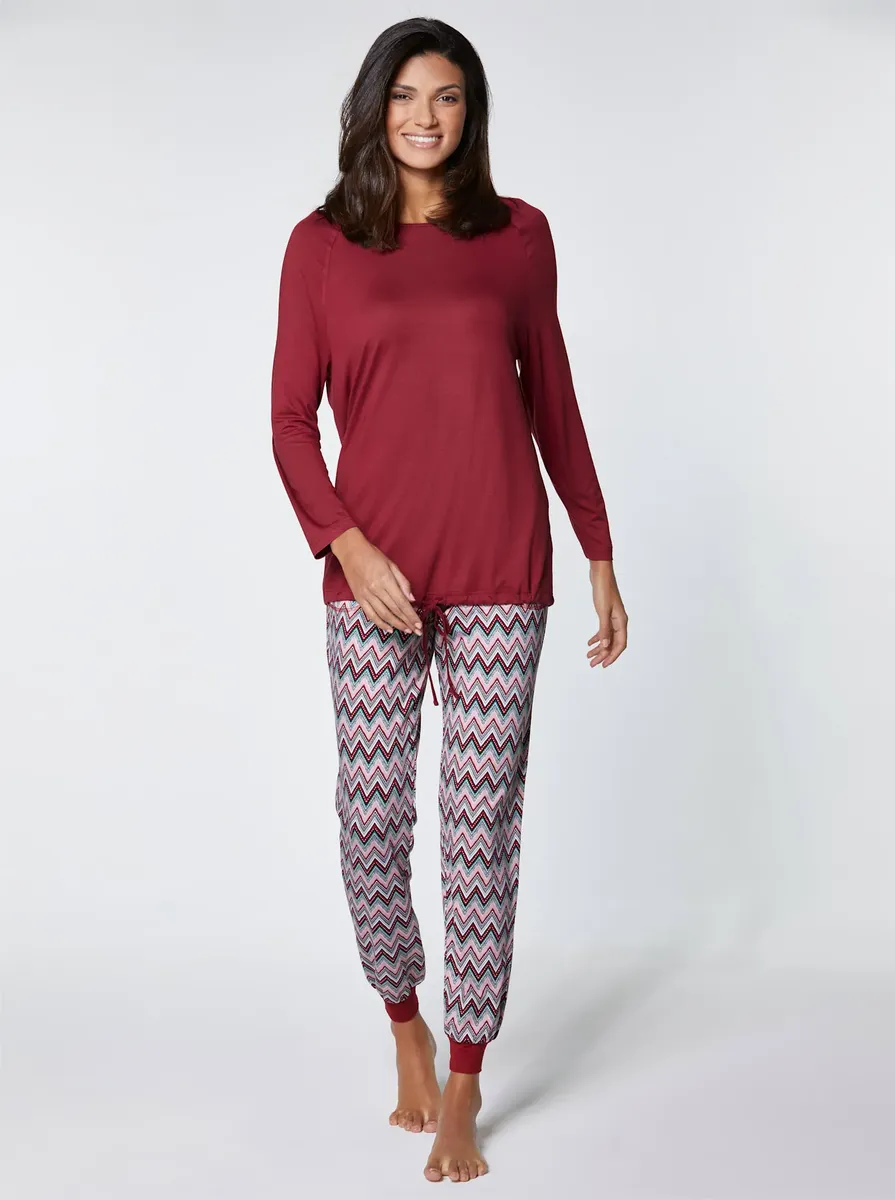 Эта пижама из мягкого трикотажа обеспечит приятные сны. Однотонный топ с круглым вырезом и нижним краем на кулиске для регулировки ширины. Брюки на эластичной талии с рисунком и эластичными манжетами. 95% вискоза, 5% эластан.