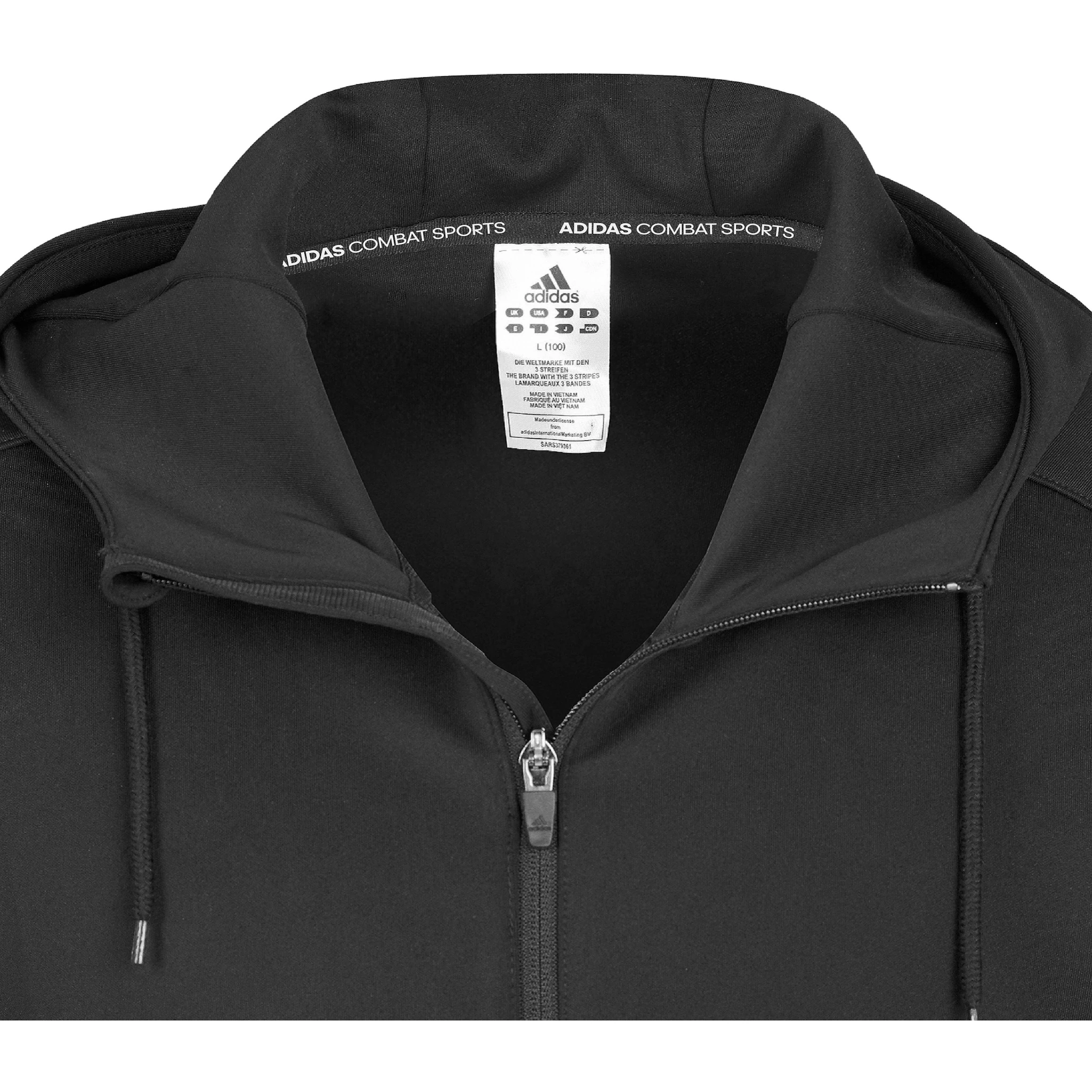 Опыт показал, что эта вещь на размер меньше обычной. Куртка Adidas изготовлена ​​из 100% полиэстера. Модель унисекс с застежкой-молнией во всю длину спереди. Легкий материал (250 г/м2) обеспечивает удобную посадку и плотное прилегание. Кроме того, эластичная лента на рукавах, принт с логотипом Adidas и надпись «COMBAT SPORTS» на левом плече. Куртку идеально можно сочетать как спортивный костюм с соответствующими брюками.