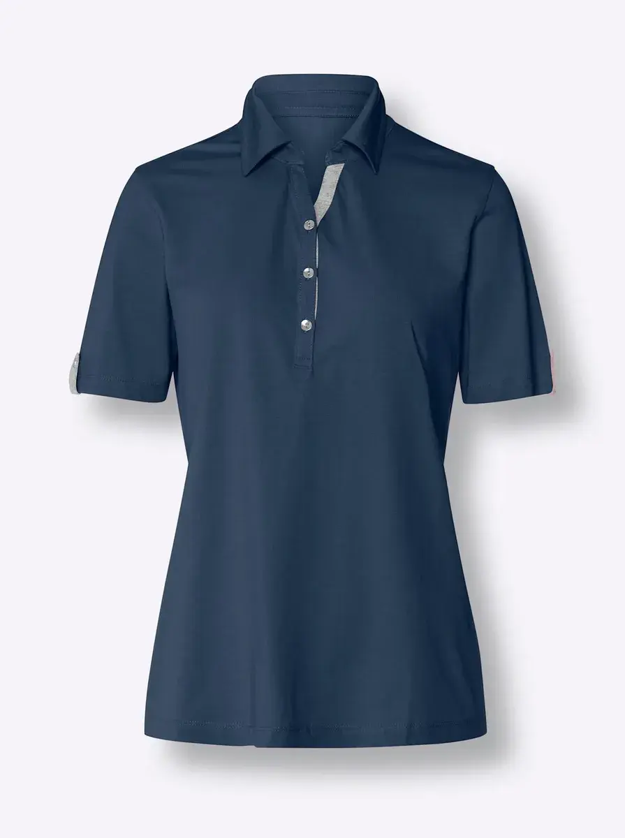Повседневный модный партнер для комбинированного настроения — привлекательная рубашка-поло на многие случаи жизни. Вставка контрастного цвета на воротнике и вдоль короткой планки с пуговицами, а также декоративная планка контрастного цвета с серебристой пуговицей. С открытым воротником-поло. 100% хлопок. Машинная стирка.