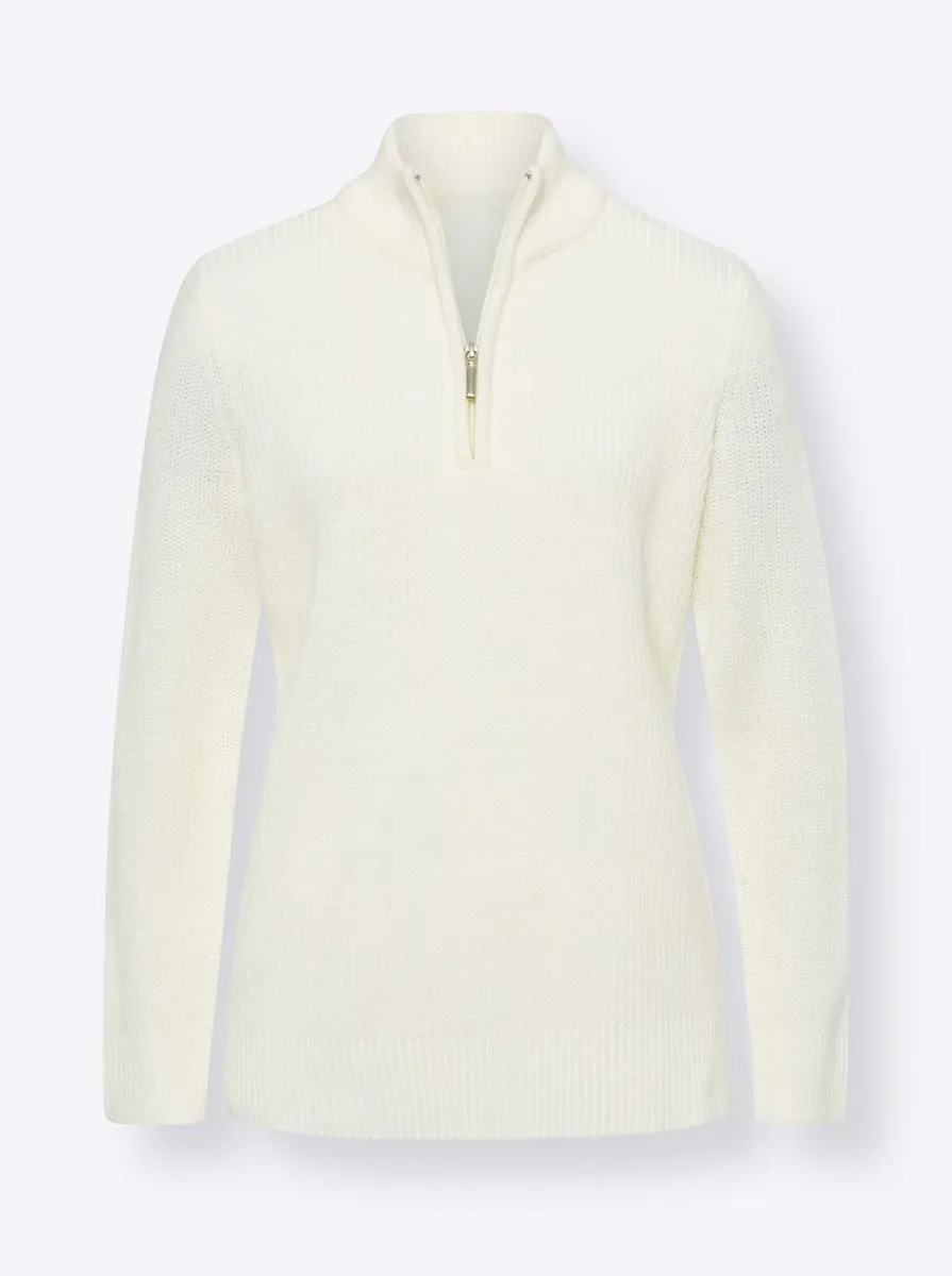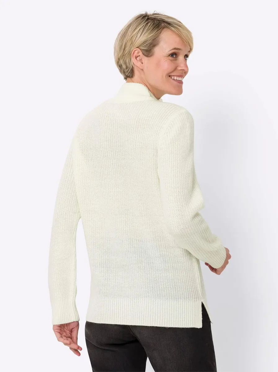 Повседневный свитер в рубчик с молнией на воротнике-стойке. С длинными рукавами и удобными разрезами по бокам. Ребристые концы. 100% полиакрил. Машинная стирка.