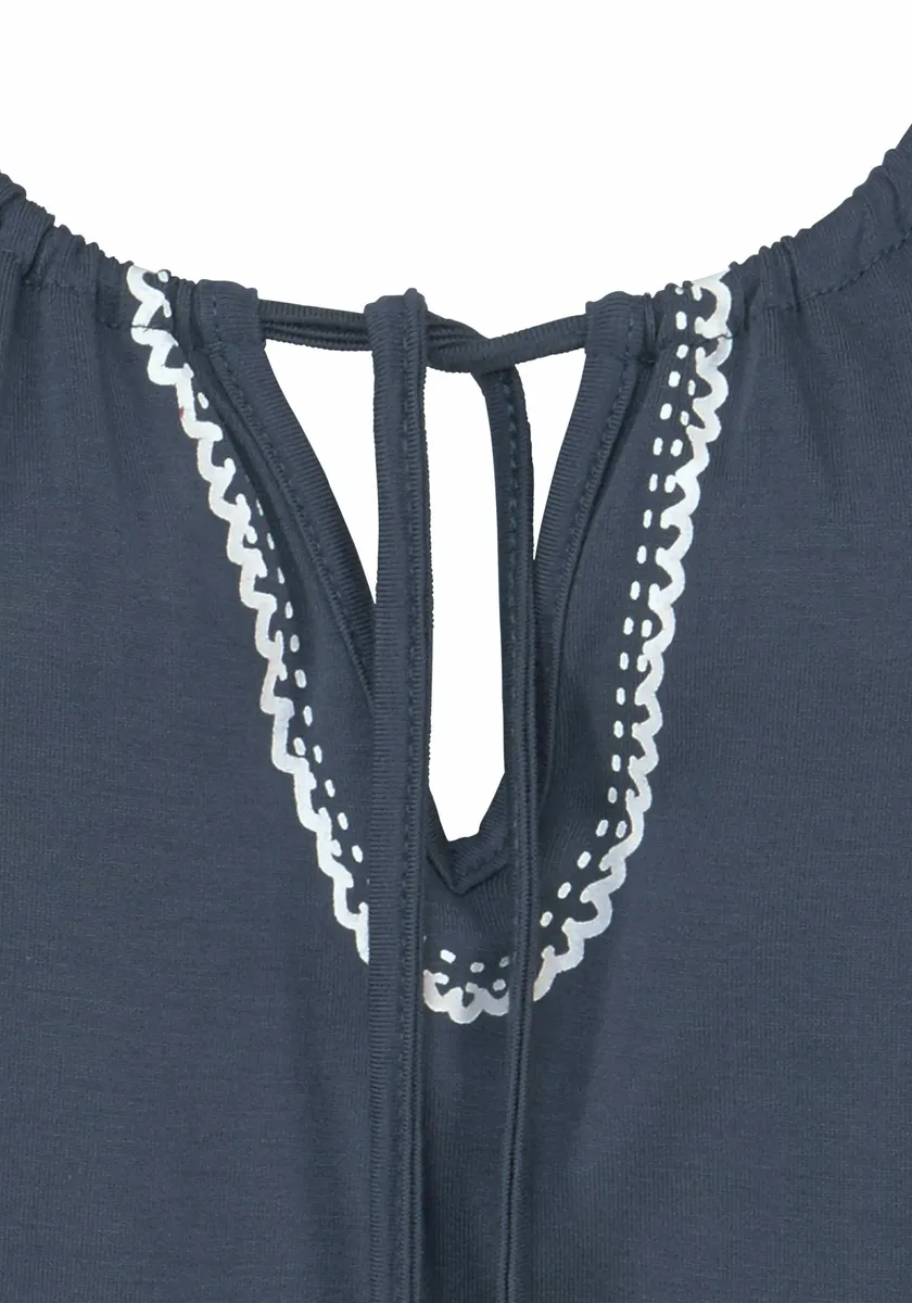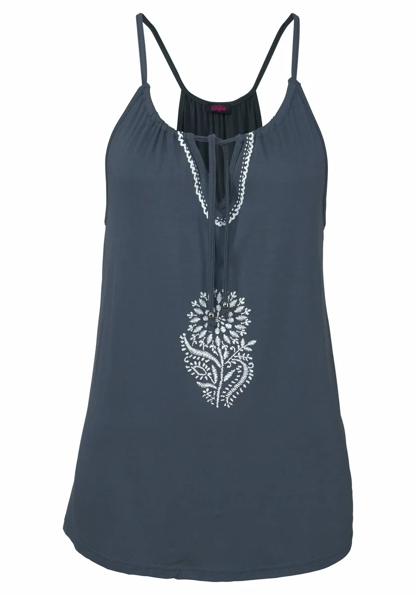 С контрастным цветным принтом в виде вышивки спереди и на V-образном вырезе. Завязка на шее с жемчужной фурнитурой серебристого цвета. Длина спинки около 52 см. Изготовлен из 95% вискозы, 5% эластана.
