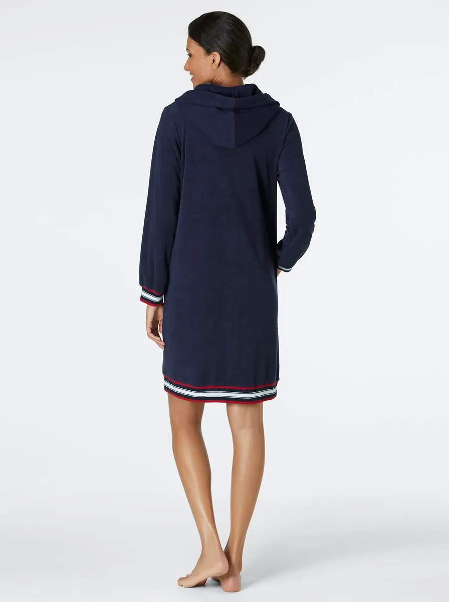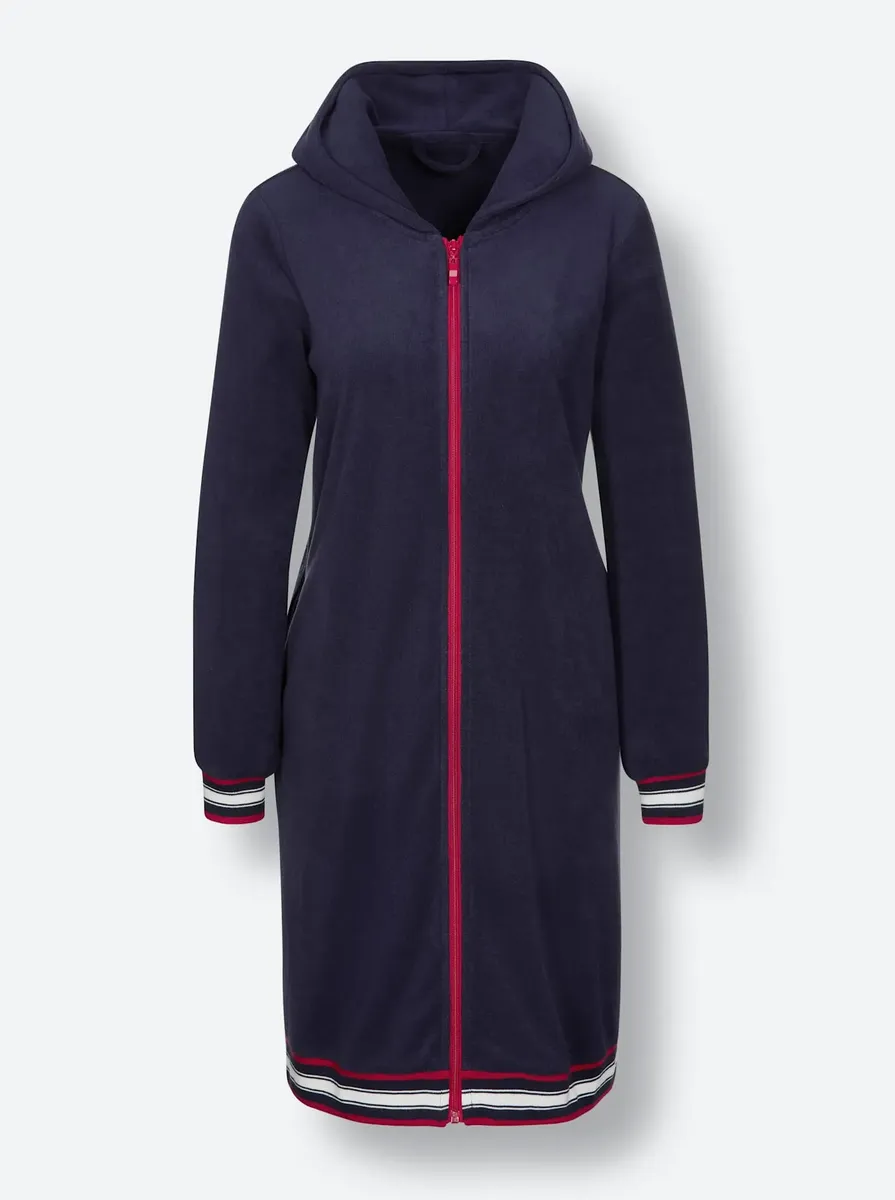 От хорошего настроения! Халат из легкой махровой ткани с капюшоном на подкладке и контрастной молнией во всю длину. 2 боковых кармана. Эластичные полосатые ребристые манжеты на рукавах и по нижнему краю. 80% хлопок, 20% полиэстер.