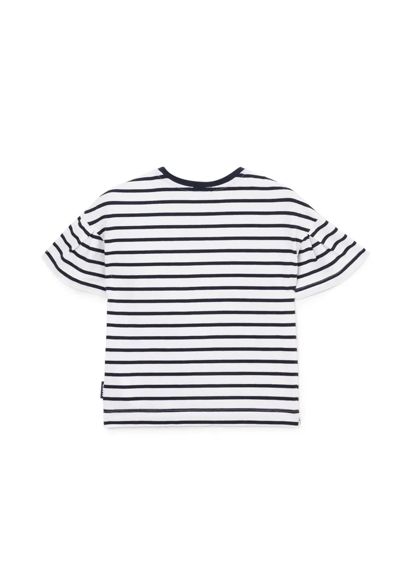 Эта рубашка с принтом для девочек в полоску изготовлена ​​из мягкой и приятной для кожи смеси хлопка. В сочетании с любыми брюками, юбкой или шортами он создает чудесные летние образы. Короткие рукава-крылышки и контрастная цветная окантовка горловины делают дизайн футболки очень выразительным.