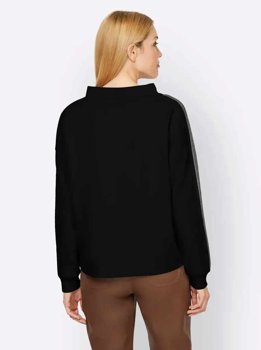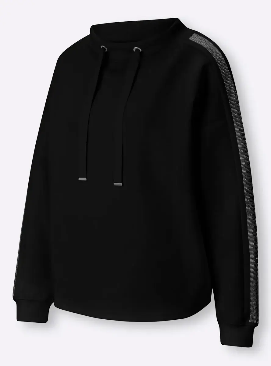 Толстовка со спущенными плечами и галлонными полосками с декоративными камнями. Воротник-стойка на круглом вырезе. Рукава с манжетами. Длинный рукав. 50% модал, 44% полиэстер, 6% эластан. Машинная стирка.