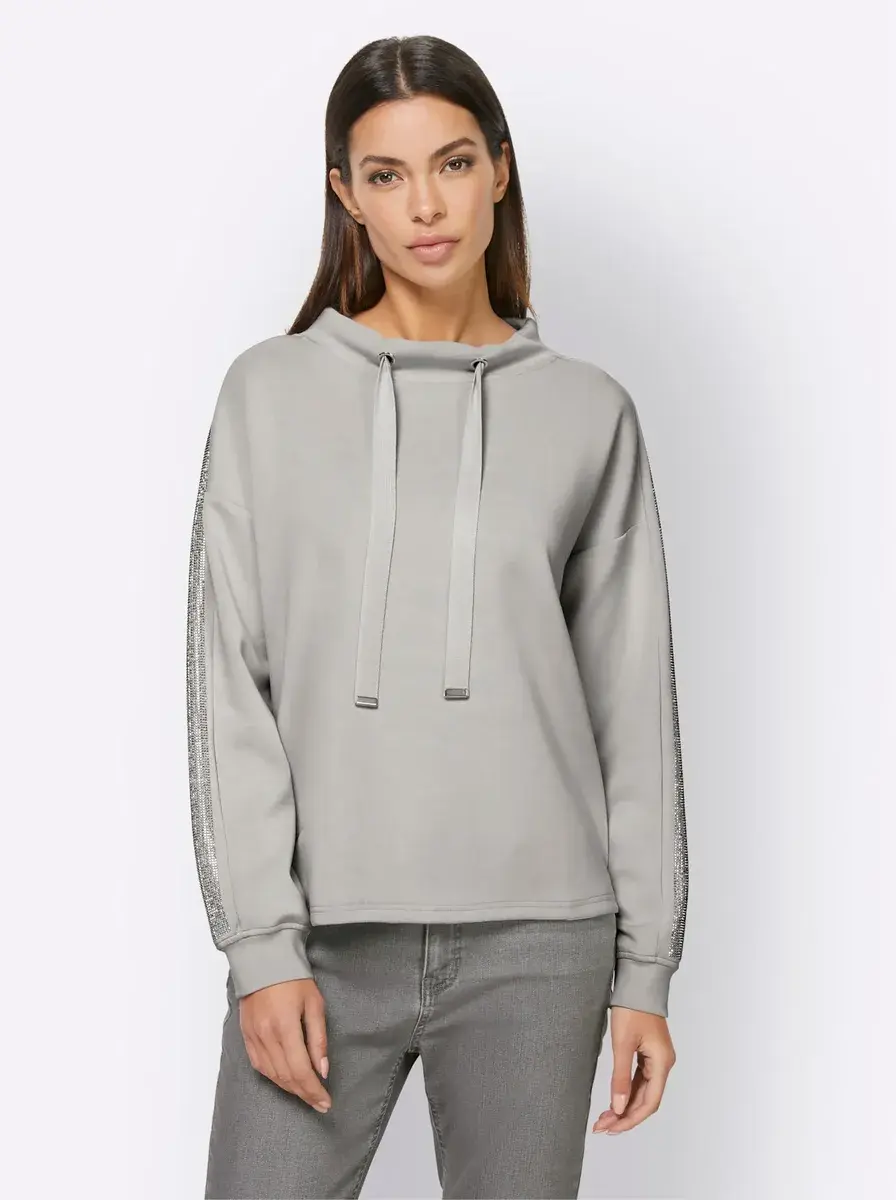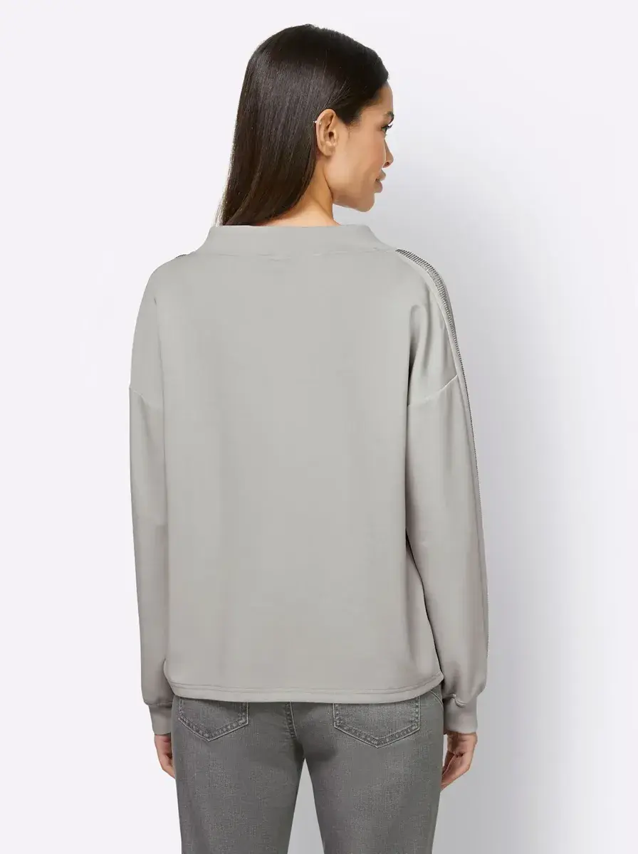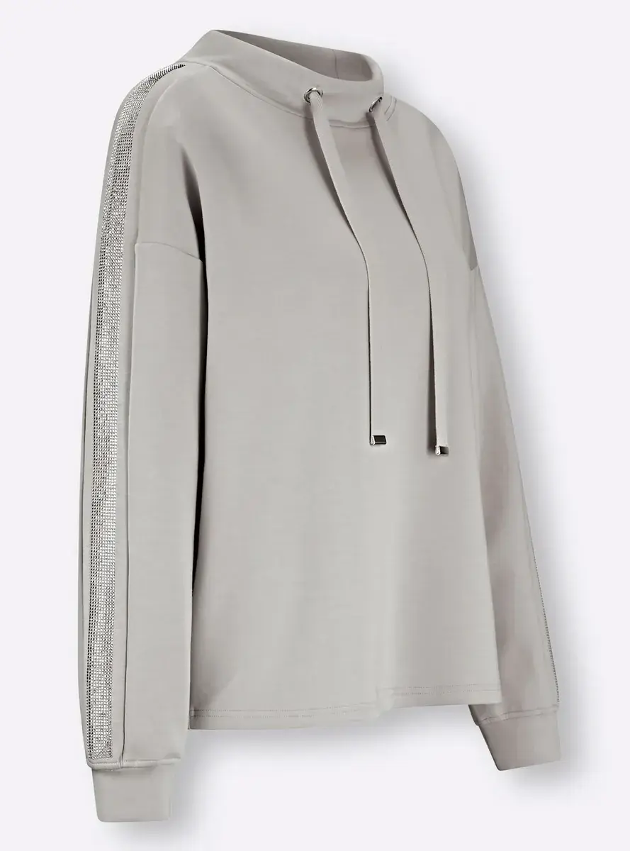 Толстовка со спущенными плечами и галлонными полосками с декоративными камнями. Воротник-стойка на круглом вырезе. Рукава с манжетами. Длинный рукав. 50% модал, 44% полиэстер, 6% эластан. Машинная стирка.
