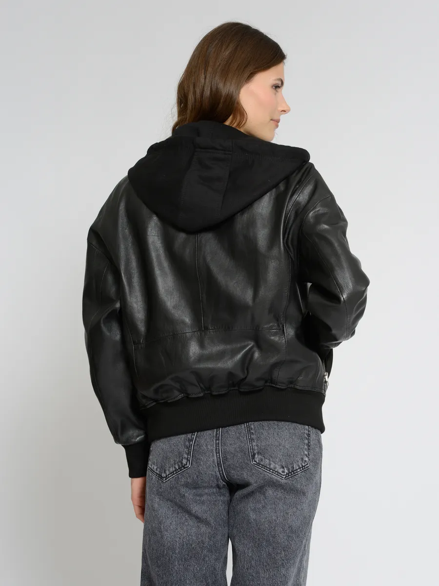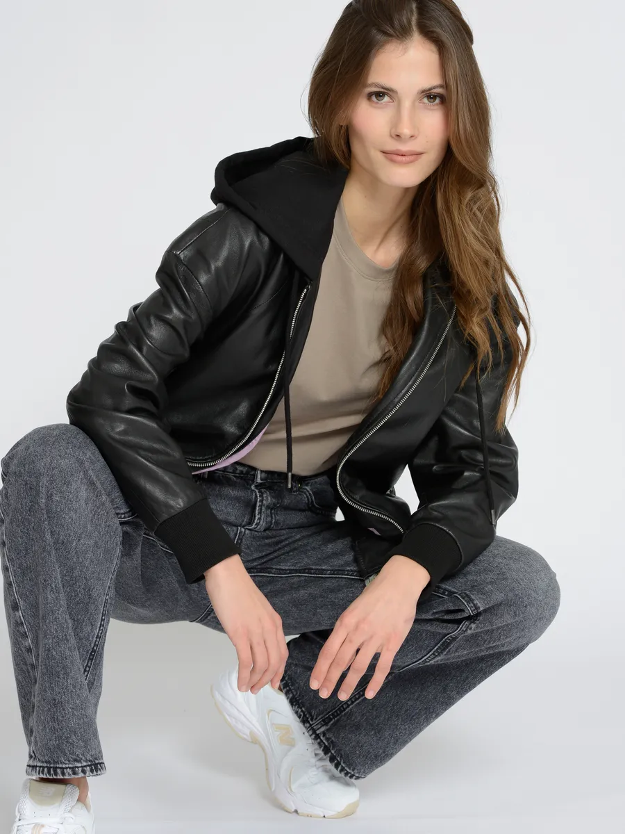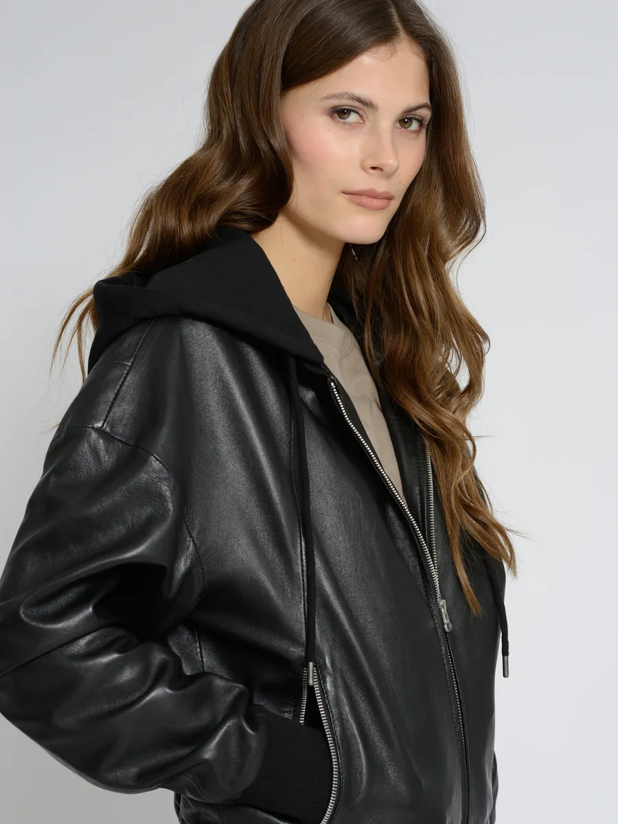 Состав материала: Внешний материал: 100% кожа ягненка / Внутренняя подкладка: 100% хлопок / Подкладка рукавов: 100% полиэстер / Трикотаж: 95% хлопок, 5% эластан / Капюшон: 55% хлопок, 45% полиэстер