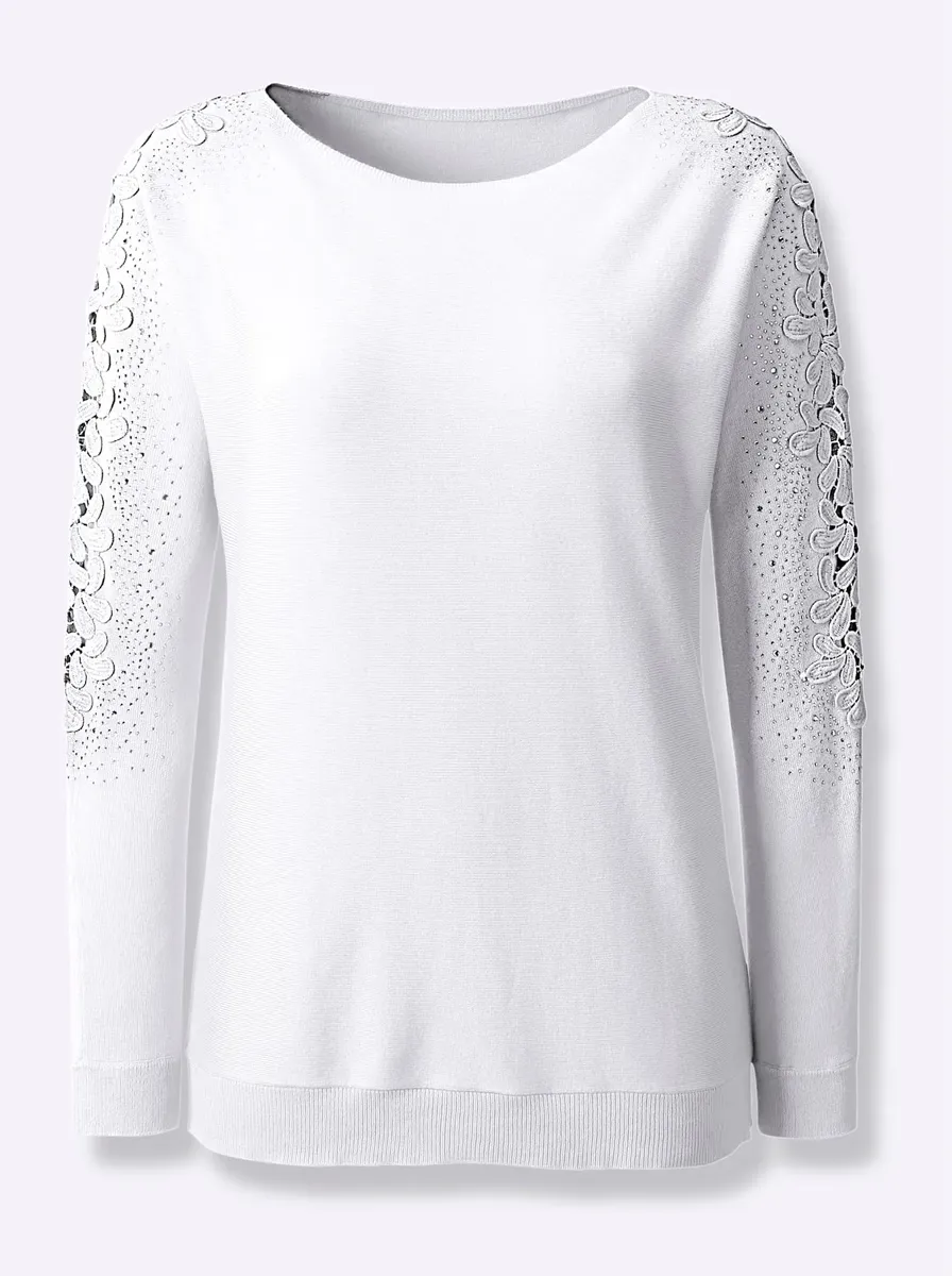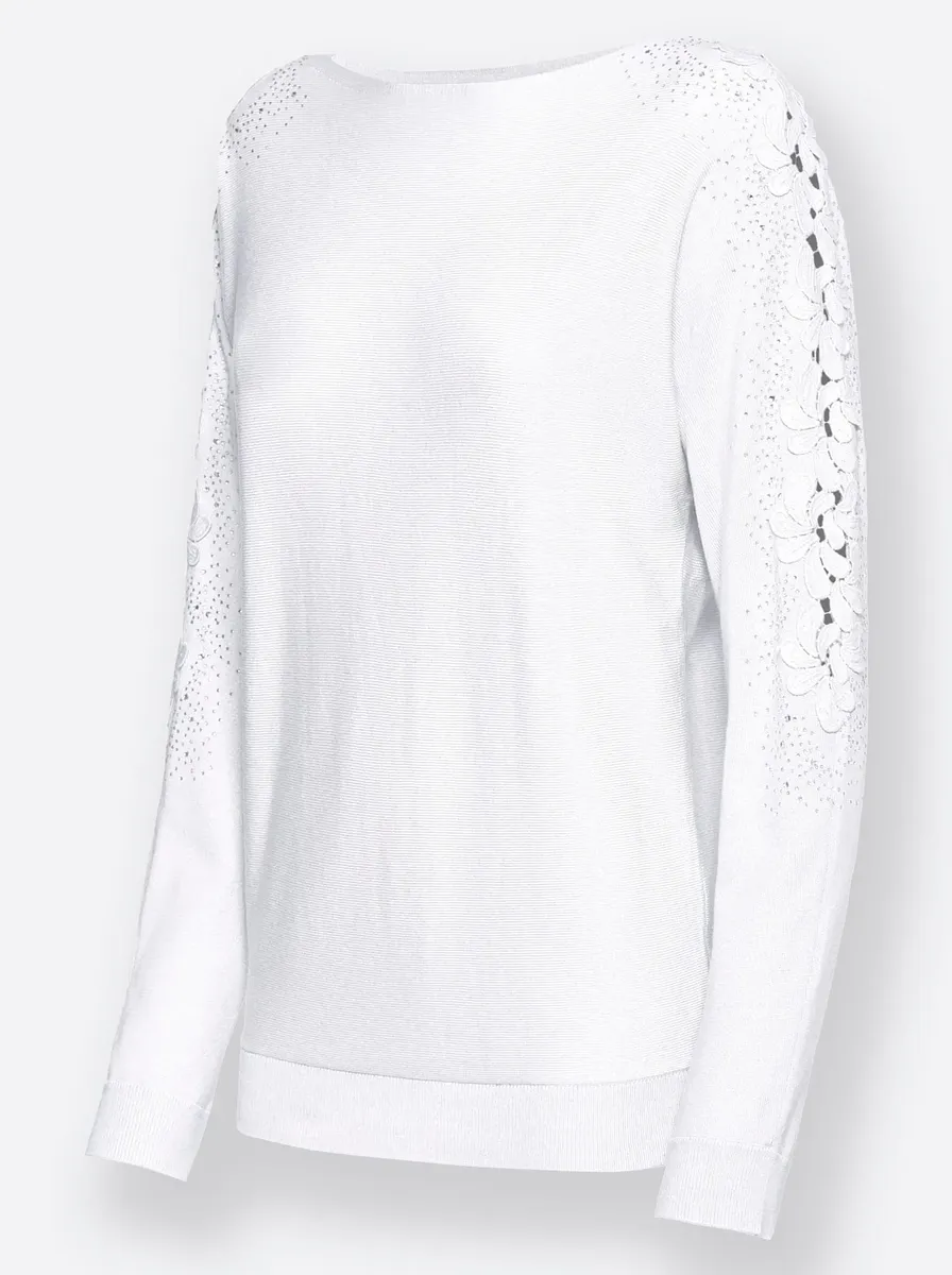 С ноткой изысканности: свитер с изысканным, слегка прозрачным цветочным кружевом и стразами соответствующего цвета на длинных рукавах «летучая мышь». Стабильный по размеру вырез «лодочка». Передняя и задняя части эластичной, мягкой тонкой вязки аккуратно связаны крест-накрест, придавая форму. Тонкие ребристые манжеты и подол. 70% вискоза, 30% полиамид. Машинная стирка.