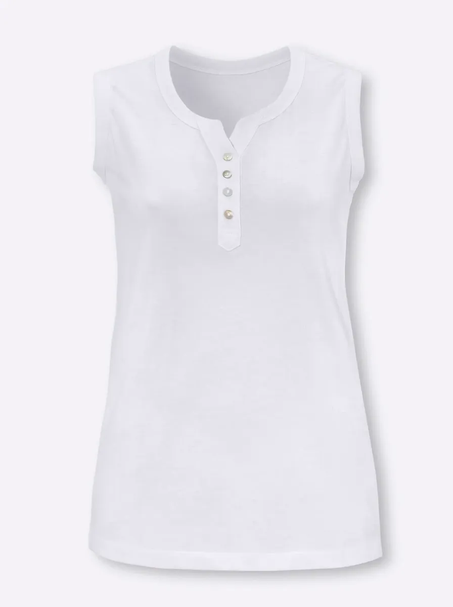 Топ базовый по топ-цене: топ-рубашка с круглым вырезом и небольшим V-образным вырезом, а также планка с перламутровыми пуговицами. Одинарный трикотаж. 100% хлопок. Машинная стирка.
