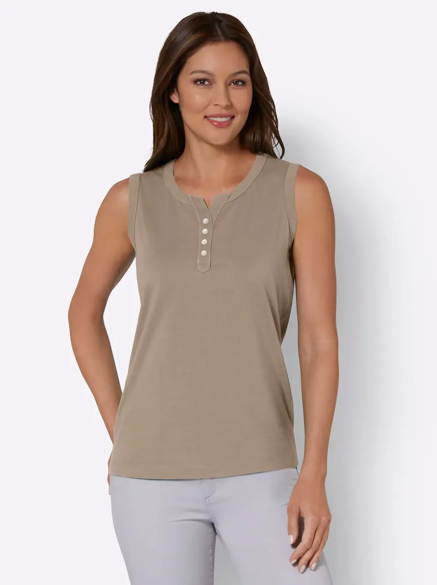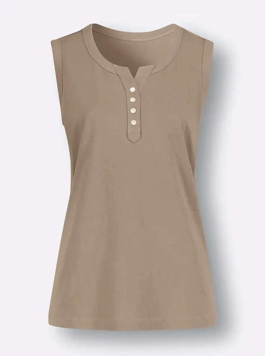 Топ базовый по топ-цене: топ-рубашка с круглым вырезом и небольшим V-образным вырезом, а также планка с перламутровыми пуговицами. Одинарный трикотаж. 100% хлопок. Машинная стирка.