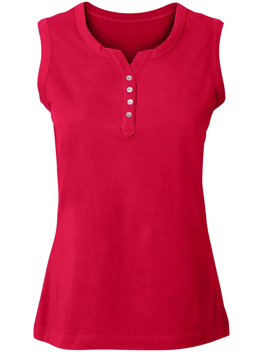Топ базовый по топ-цене: топ-рубашка с круглым вырезом и небольшим V-образным вырезом, а также планка с перламутровыми пуговицами. Одинарный трикотаж. 100% хлопок. Машинная стирка.