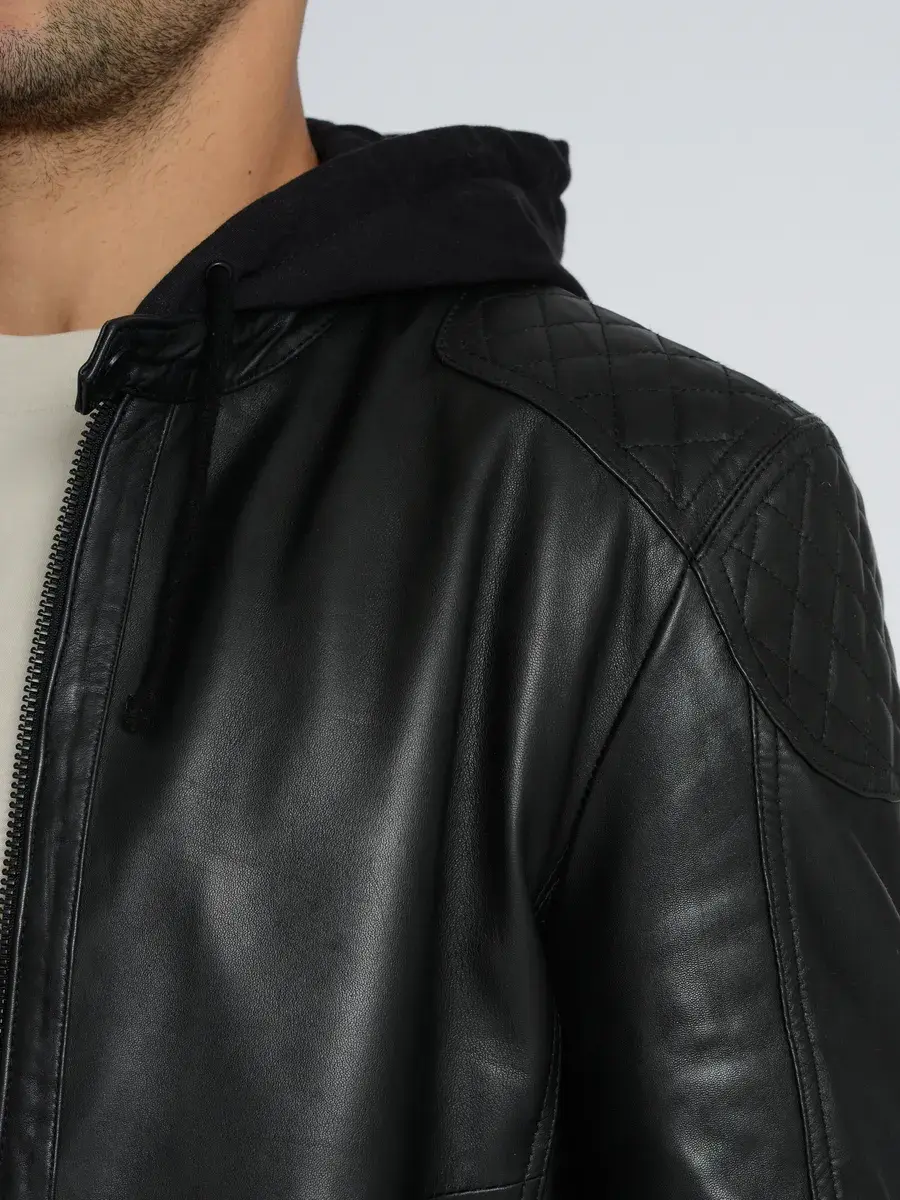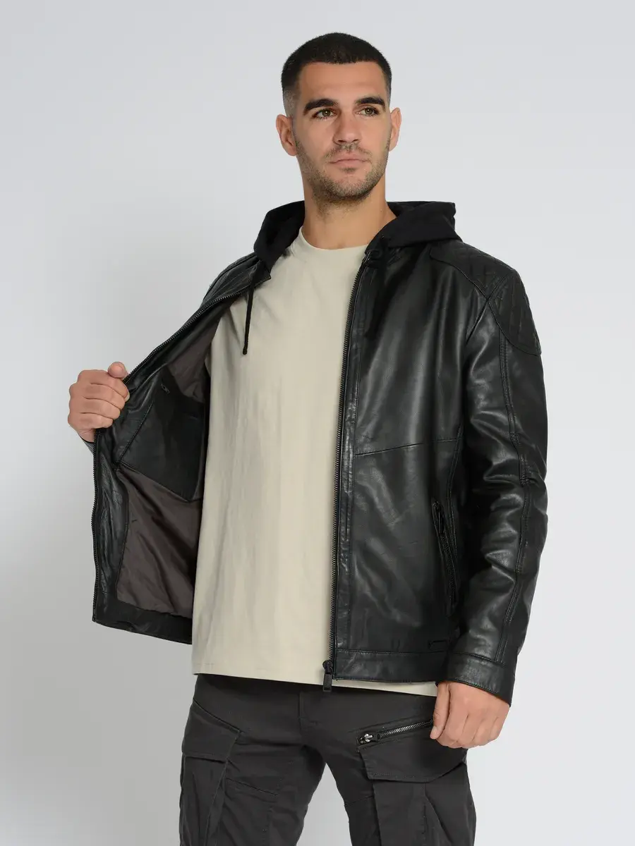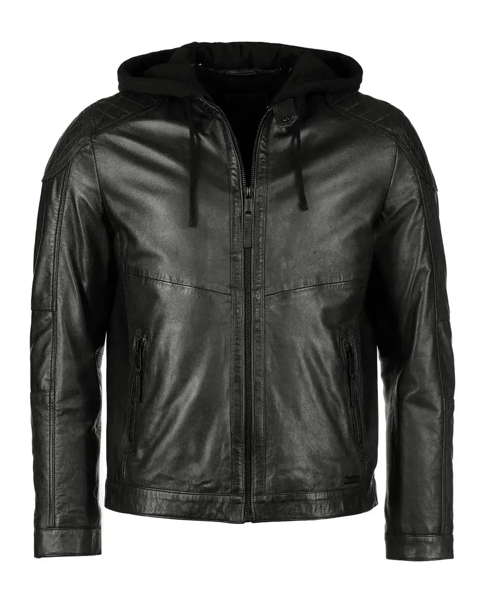 Подробности Капюшон: съемный капюшон, капюшон на кулискеПодкладка: легкая подкладкаСтрана-производитель: ИндияВоротник/вырез: воротник-стойкаМатериал подкладки: 100% хлопокМатериал капюшона: 52% полиэстер, 48% хлопокМатериал внешней ткани: 100% кожа ягненкаМатериал набивки: 100% полиэстерМатериал рукава подкладка: 100% полиэстерСвойства материала: КожаСостав материала: Внешний материал: 100% кожа ягненка / Внутренняя подкладка: 100% хлопок / Подкладка рукавов: 100% полиэстер / Набивка: 100% полиэстер / Капюшон: 52% полиэстер, 48% хлопокРазмер модели: 1,85 размер м. MFit: Regular FitТип/стиль продукта: байкерская кожаная курткаТип застежки: молния