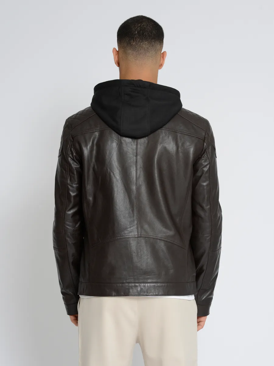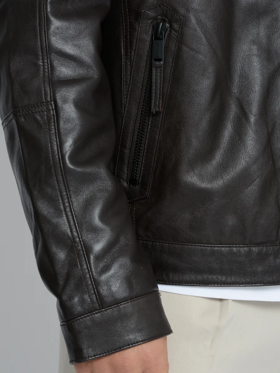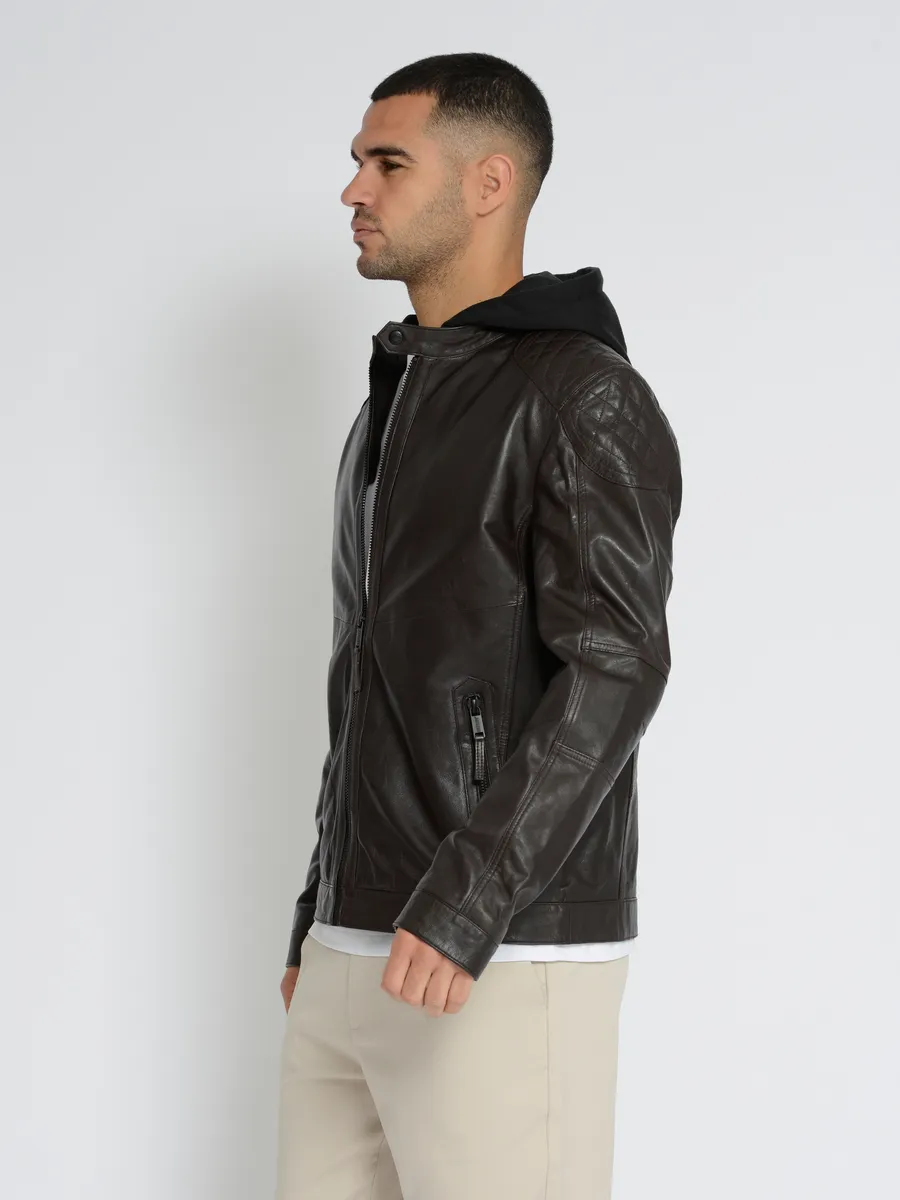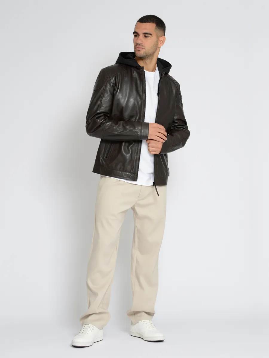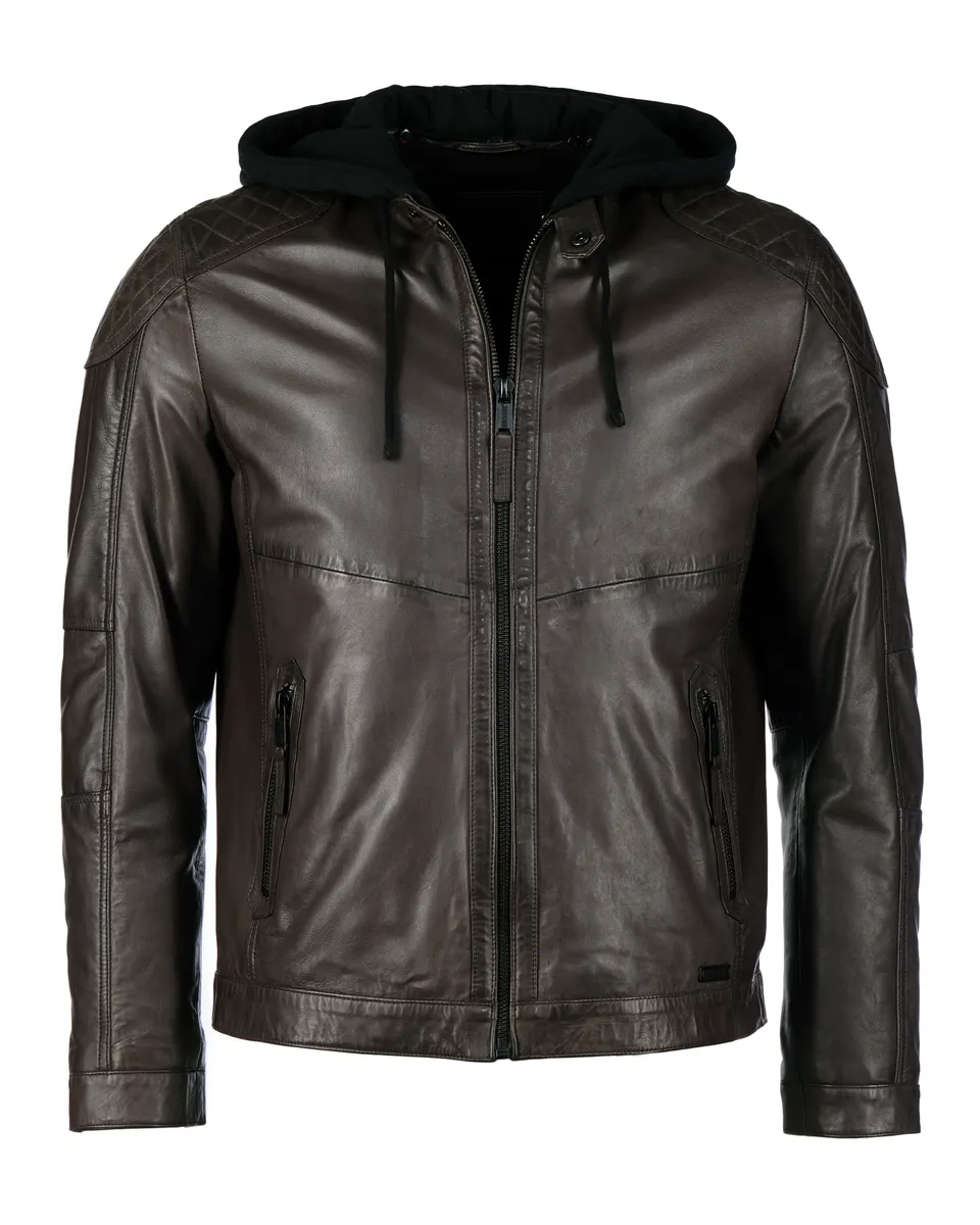 Подробности Капюшон: съемный капюшон, капюшон на кулискеПодкладка: легкая подкладкаСтрана-производитель: ИндияВоротник/вырез: воротник-стойкаМатериал подкладки: 100% хлопокМатериал капюшона: 52% полиэстер, 48% хлопокМатериал внешней ткани: 100% кожа ягненкаМатериал набивки: 100% полиэстерМатериал рукава подкладка: 100% полиэстерСвойства материала: КожаСостав материала: Внешний материал: 100% кожа ягненка / Внутренняя подкладка: 100% хлопок / Подкладка рукавов: 100% полиэстер / Набивка: 100% полиэстер / Капюшон: 52% полиэстер, 48% хлопокРазмер модели: 1,85 размер м. MFit: Regular FitТип/стиль продукта: байкерская кожаная курткаТип застежки: молния