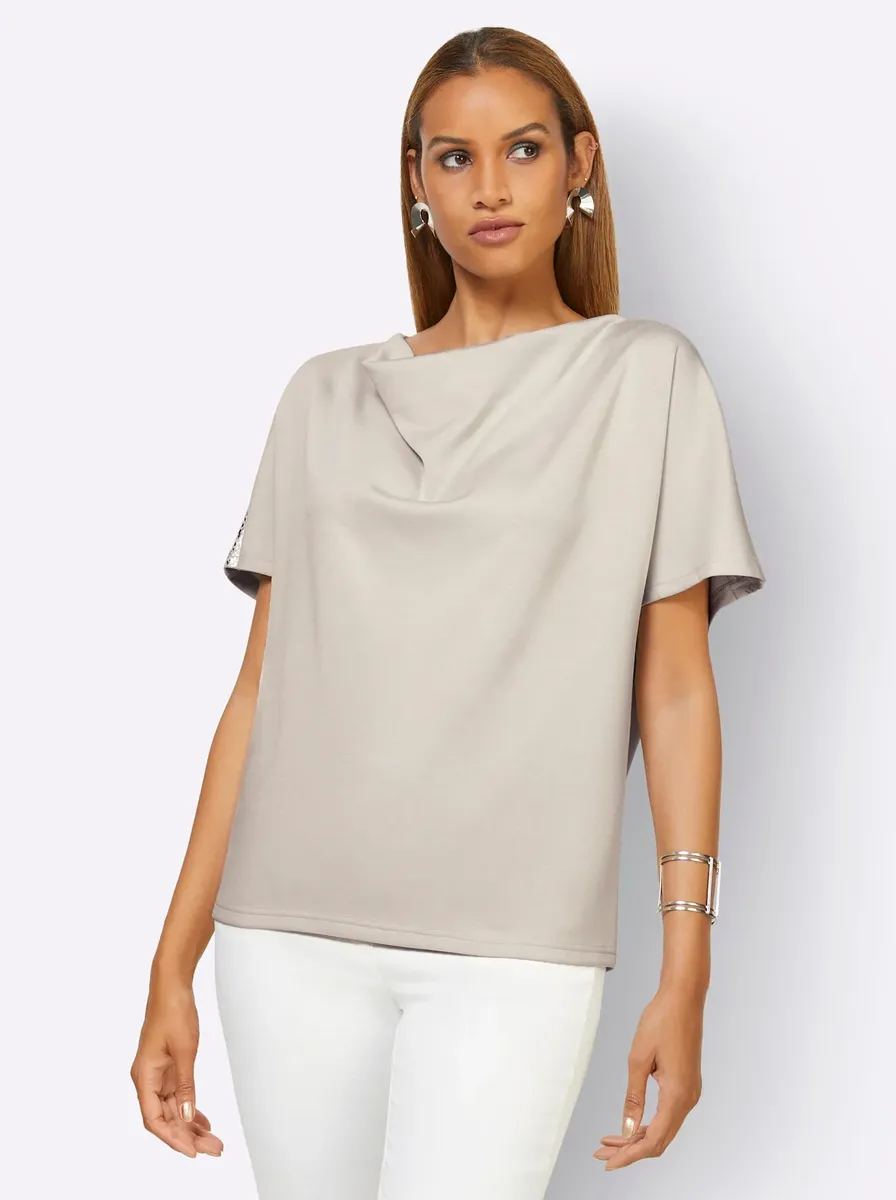 Эта толстовка повседневного кроя идеально подойдет для вашего следующего торжественного выхода. Элегантное и мягкое изделие с модальным наполнением имеет шелковисто-матовый блеск, привлекательный вырез в виде водопада, а небрежный вырез на плечах украшен вставкой с принтом, украшенной блестящей пряжей. 50% модал, 44% полиэстер, 6% эластан. Машинная стирка.