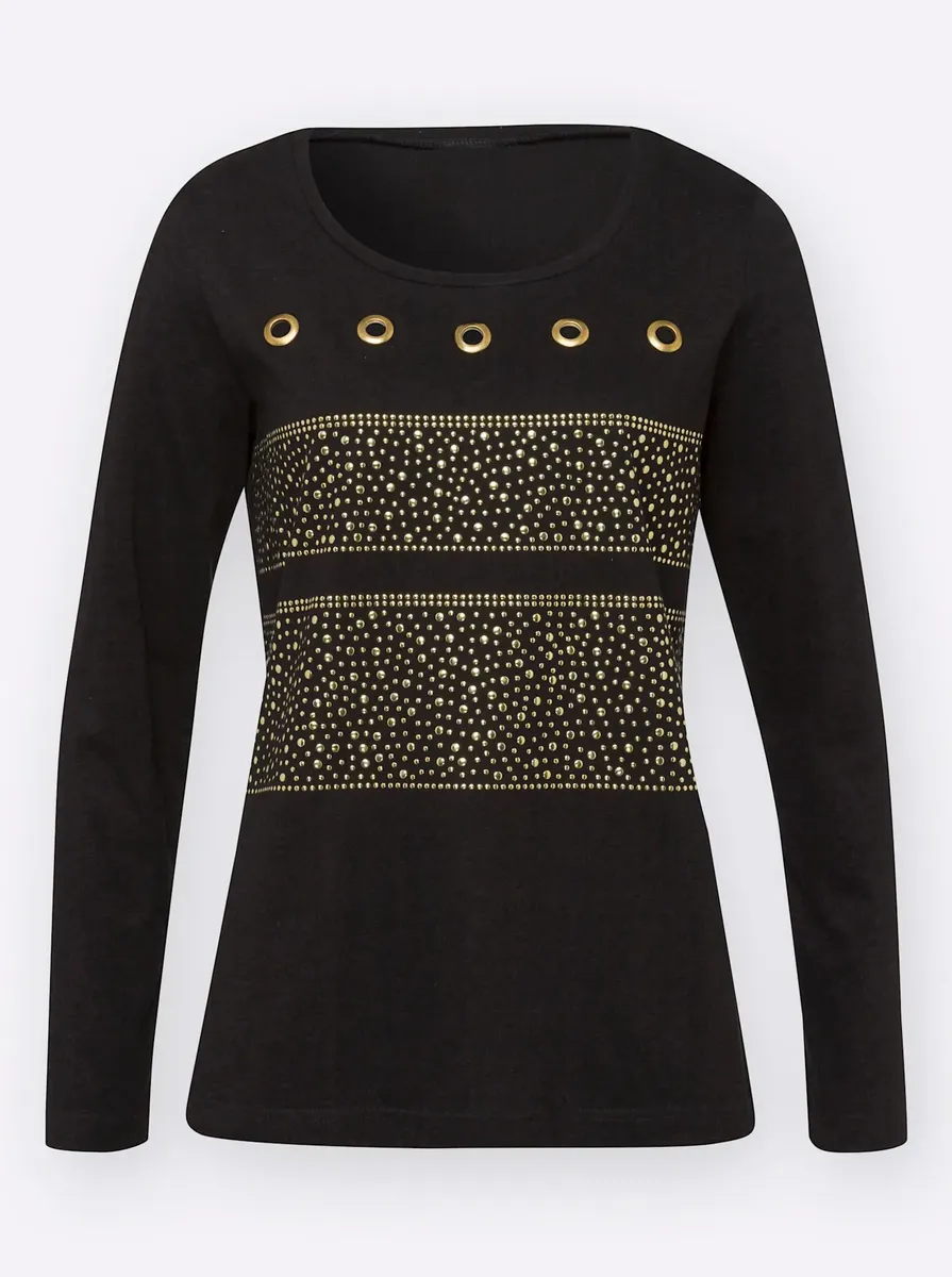 Эта толстовка представляет собой красивое зрелище, украшенная спереди многочисленными золотистыми люверсами и заклепками. 100% хлопок. Машинная стирка.