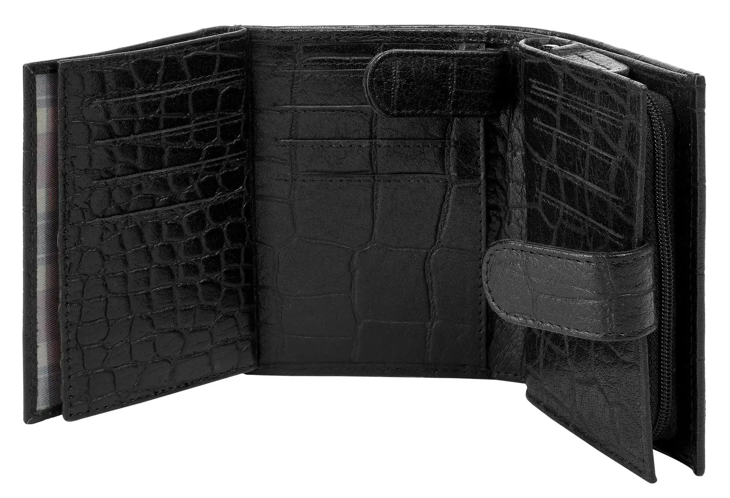 Подчеркните свой стиль с помощью повседневного кожаного кошелька от Cluty. Многочисленные отделения для карт и смотровые площадки позволяют безопасно и организованно хранить деловые, клиентские и кредитные карты. Отдельное отделение для монет с молнией по всему периметру особенно полезно. Это означает, что вы всегда можете быстро и легко получить доступ к своим монетам. * 100% воловья кожа* Застежка на кнопки* 1 отдельное отделение для монет на молнии* 1 отделение для купюр* 12 отделений для карт* 1 накладной карман* 3 видимых кармана* 3 складкиОсобенности: натуральная кожаДополнение к названию: натуральная кожаШирина: 12 смВес: 100Высота: 9 смГлубина : 4 смКоличество внутренних карманов: 1Количество отделений для карт: 12Количество отделений для купюр: 1Количество видимых отделений: 3Внешний материал: 100% воловья кожаРазмер: один размерОсновная застежка: кнопкиВнутренний цвет: черныйМатериал внутри: кожаВнутренний вид: соответствующий цветВес: 0,1 кг Отделение для монет : да (молния)Оптика Поверхность: тиснение под рептилиюОбъем: 0,1Формат: портретный формат