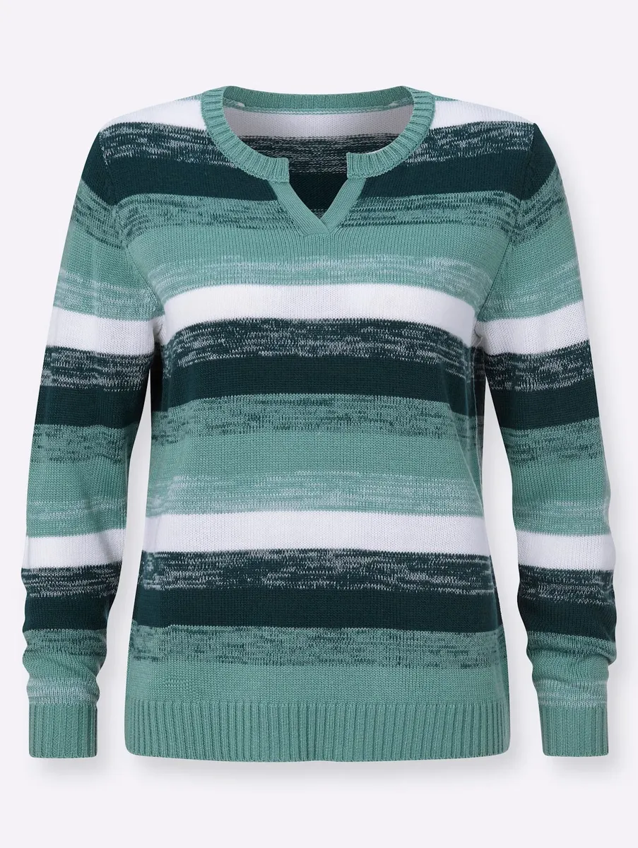 Позвольте себе быть очарованным свитером свежих цветов и изящным полосатым дизайном. Круглый вырез с небольшим V-образным вырезом, манжеты и нижний край в рубчик. Связала по форме. 100% полиакрил. Машинная стирка.