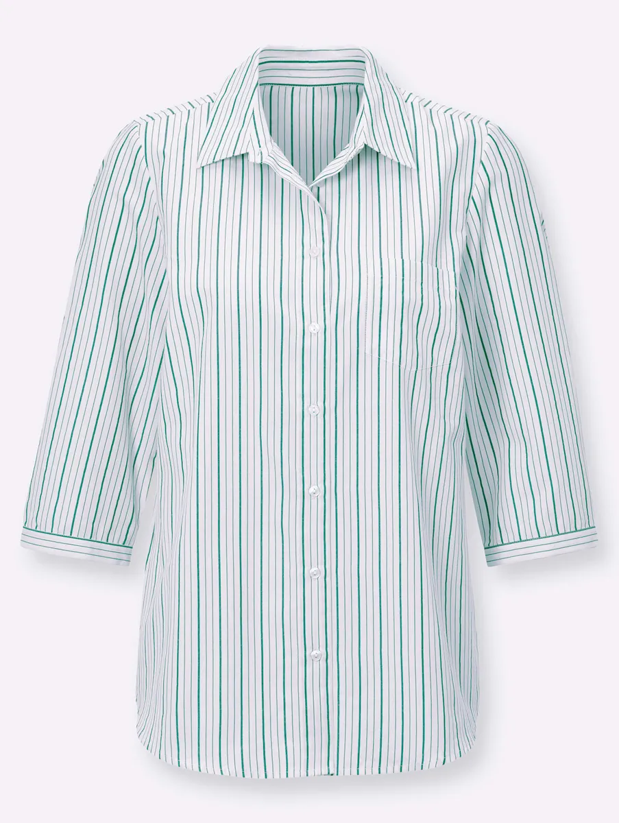 Мягкая блузка с содержанием хлопка впечатляет своим полосатым дизайном. С рубашечным воротником, планкой на пуговицах, практичным накладным нагрудным карманом и рукавами длиной 3/4, заканчивающимися манжетами на пуговицах в горизонтальную полоску. Слегка закругленный край спереди. Вытачки на груди обеспечивают хорошую посадку. 75% полиэстер, 25% хлопок. Машинная стирка.