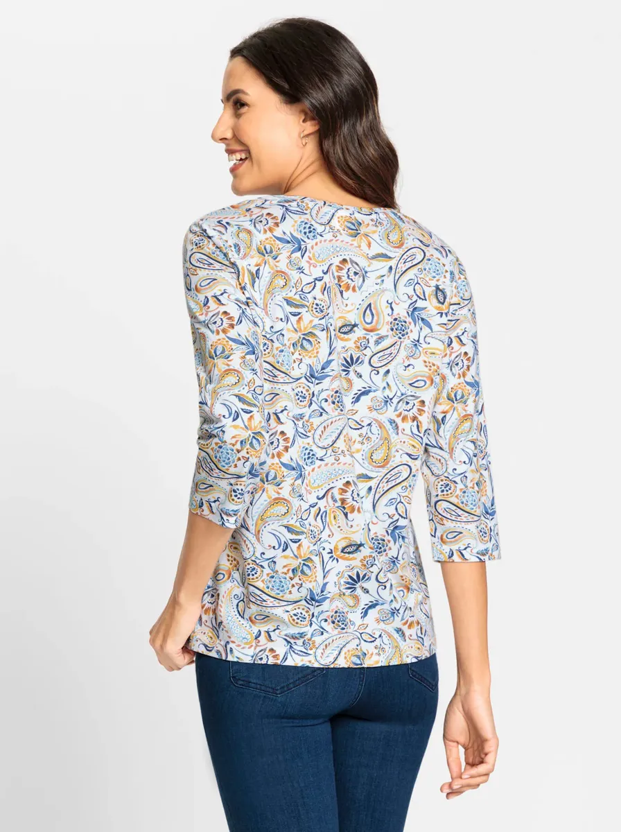 Мягкая качественная рубашка приобретает привлекательный вид благодаря сочетанию в дизайне элементов цветов и пейсли. С круглым вырезом и рукавами 3/4. Поддержите инициативу «Хлопок, сделанный в Африке». 50% хлопок, 50% модал. Машинная стирка.