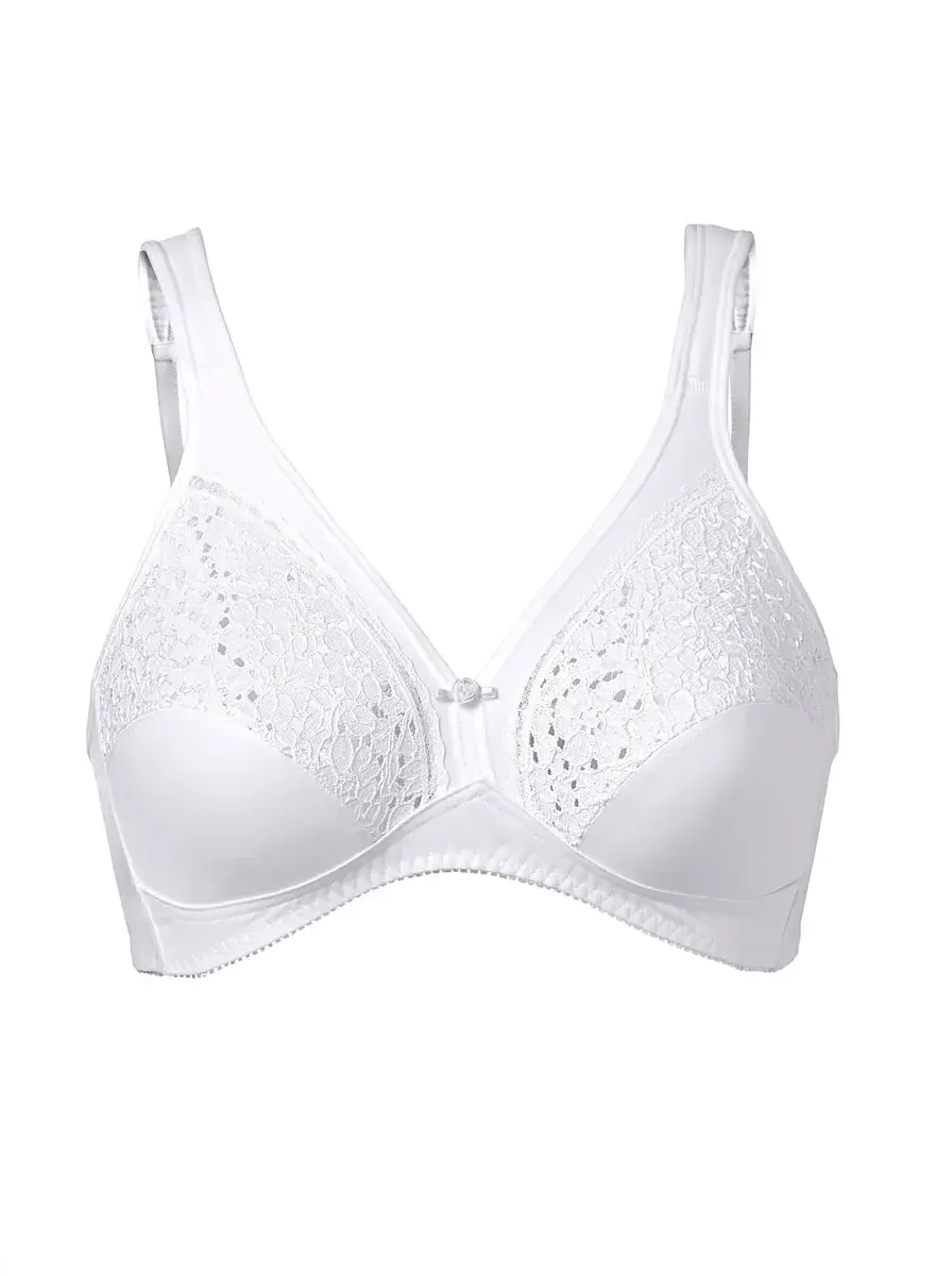 Мягкий бюстгальтер без косточек от Speidel. Двухсекционные чашки с кружевом и окантовкой по линии декольте. Мягкие комфортные ремни. 33% хлопок, 31% полиэстер, 27% полиамид, 9% эластан.