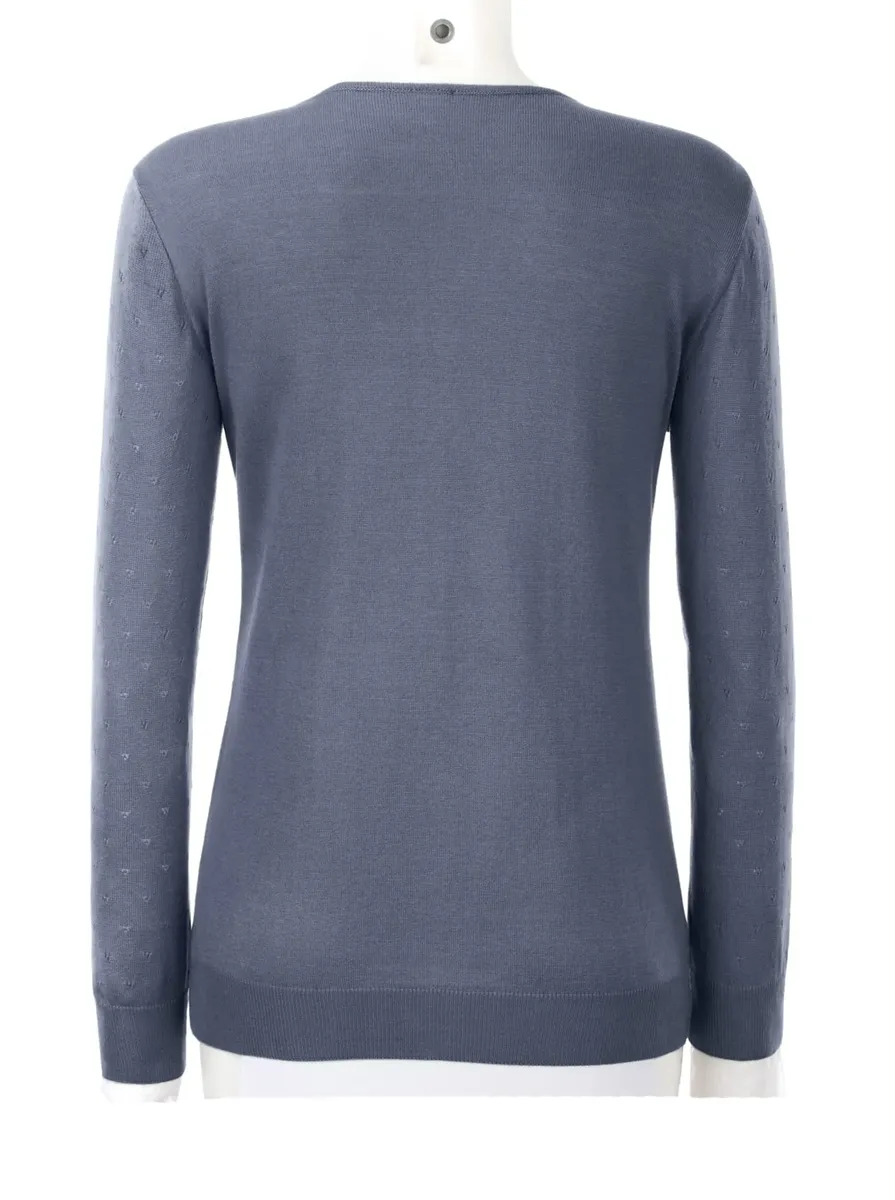 Мягкий и удивительно эластичный тонкий трикотаж: свитер с воздушным тонким ажурным узором спереди и на рукавах. Ребристый V-образный вырез, манжеты и подол. Облегающая фигуру форма. 60% вискоза, 40% хлопок. Машинная стирка.