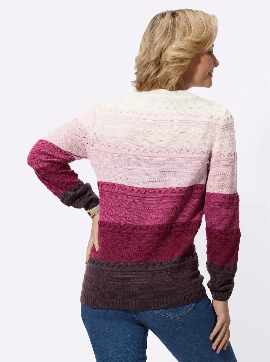 Мягкий свитер в цветные полоски и эффектное сочетание структур. С круглым вырезом и ребристыми манжетами на длинных рукавах и по нижнему краю. 100% полиакрил. Машинная стирка.