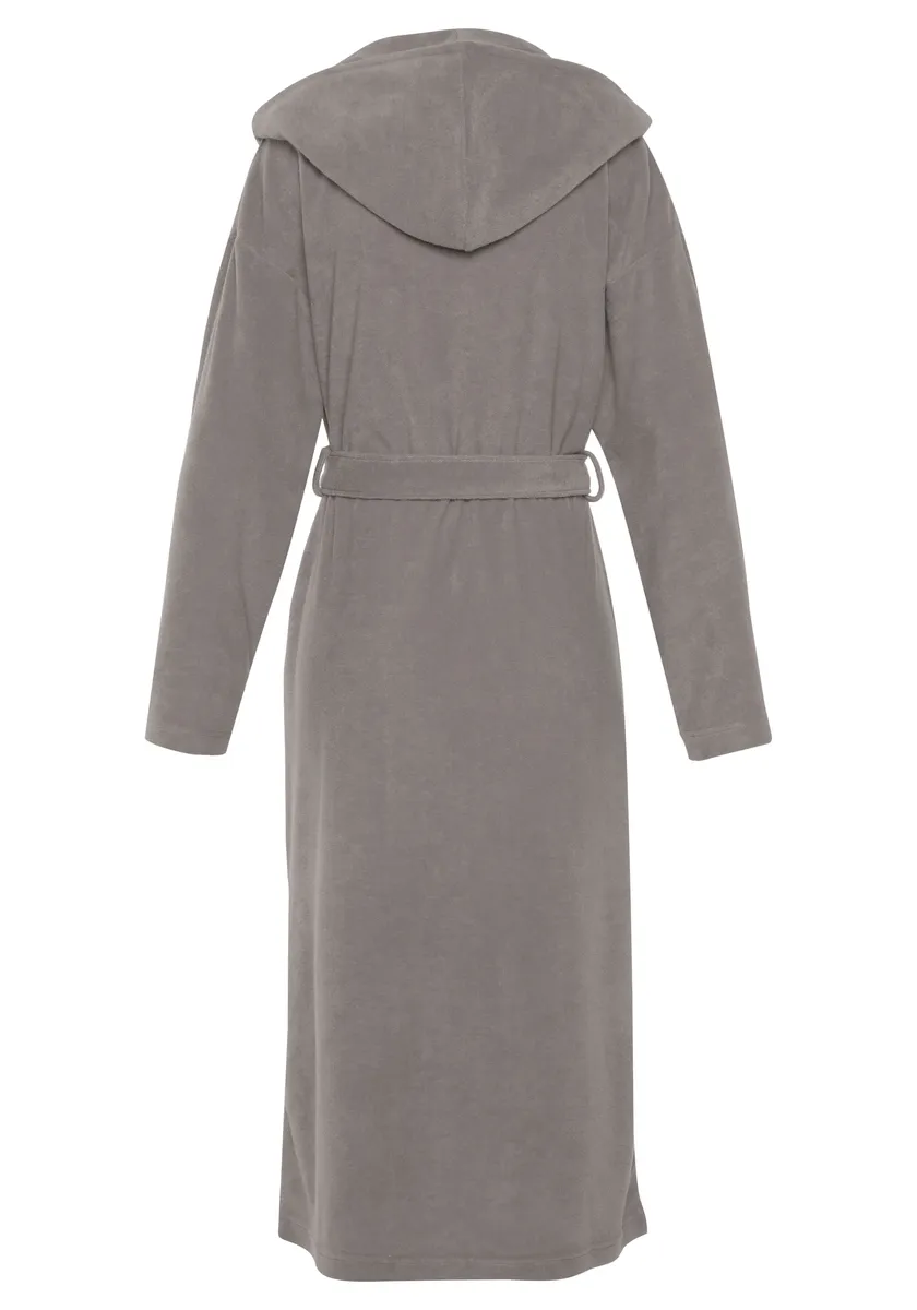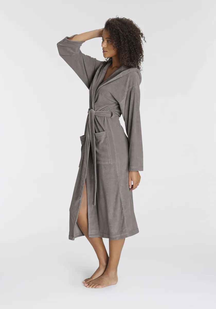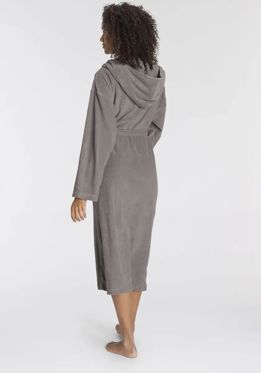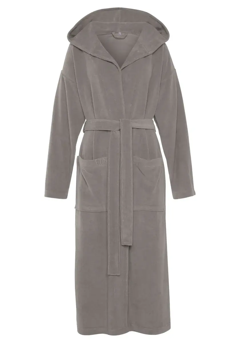 Мягкий халат длиной до икры с капюшоном и свободным поясом на талии. Изготовлен из 80% хлопка, 20% полиэстера.