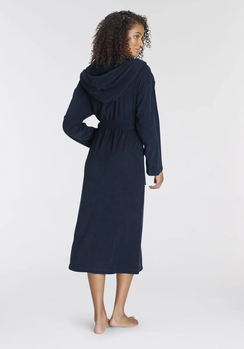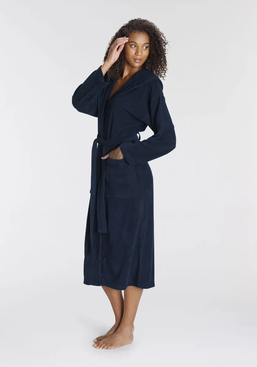 Мягкий халат длиной до икры с капюшоном и свободным поясом на талии. Изготовлен из 80% хлопка, 20% полиэстера.