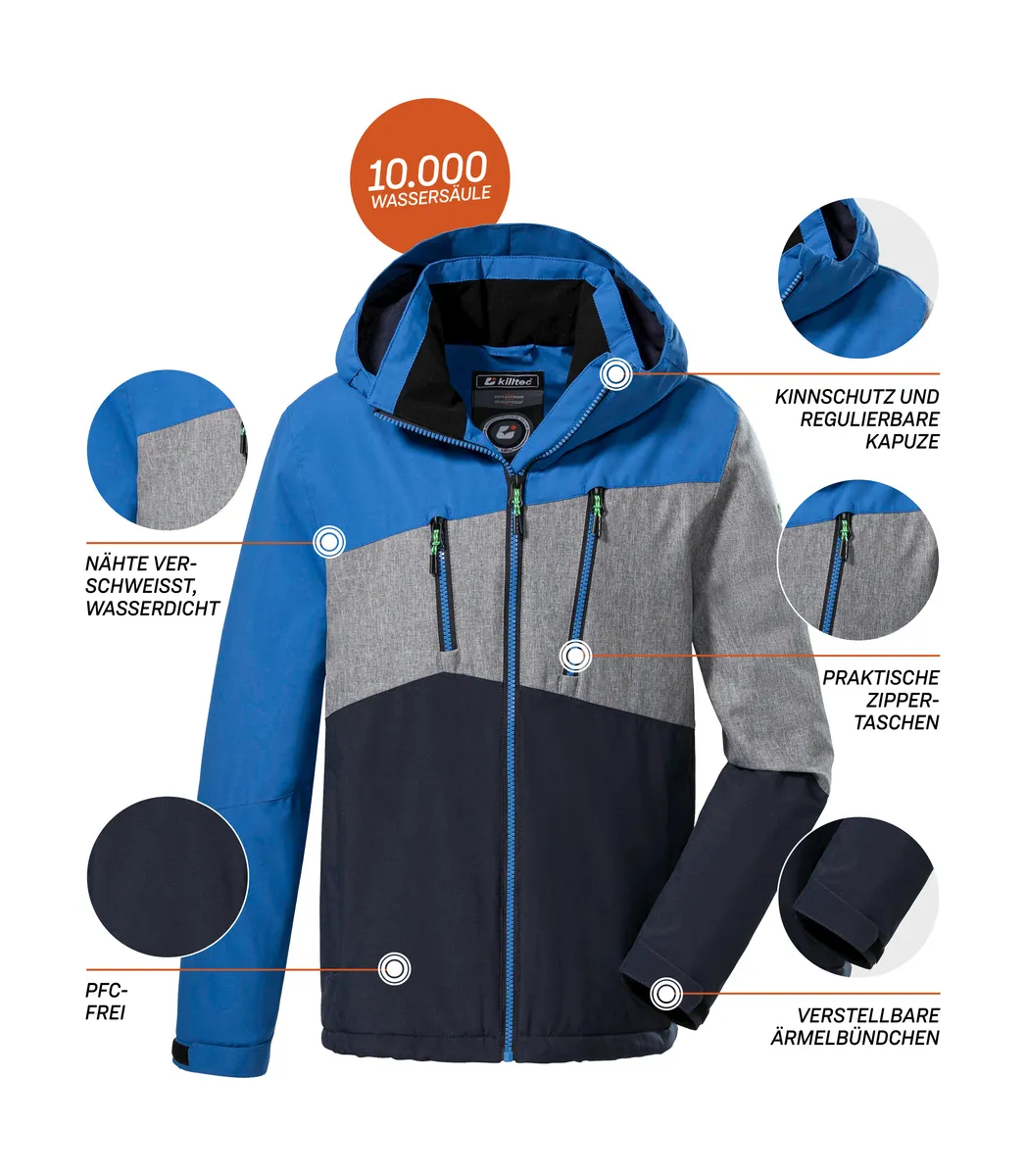С этой детской зимней курткой killtec на толстой подкладке веселью на снегу нет предела! Асимметричный дизайн с цветовыми блоками подарит вам хорошее настроение. Водяной столб высотой 10 000 мм и проклеенные швы делают куртку на 100% водонепроницаемой и ветронепроницаемой. Функциональная куртка также покрыта дышащим ламинатом. Куртка и капюшон на подкладке из мягкого флиса. Манжеты и капюшон регулируются. В многочисленных карманах можно хранить ключи, ски-пассы и т. д. Ширину края можно регулировать с помощью кулиски. Защита подбородка на молнии предотвращает защемление кожи. Для killtec особенно важно сделать коллекции более устойчивыми и ориентированными на будущее. killtec все больше полагается на более ответственные производственные процессы. Поэтому эта куртка была пропитана веществами, не содержащими фтора.