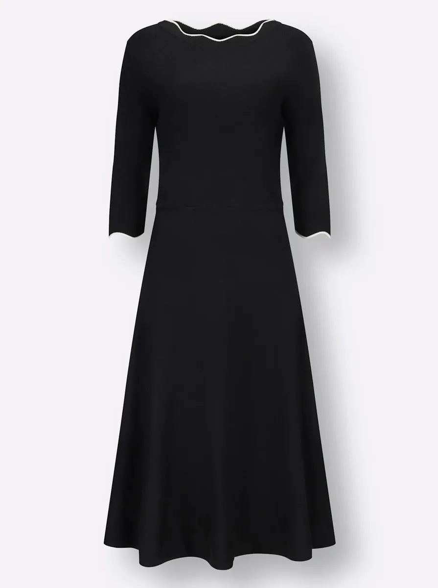 Мягко струящееся трикотажное платье элегантной тонкой вязки. Волнистые контрастные цветные края на вырезе-лодочке и на рукавах 3/4 с оборкой. Шов на талии подчеркивает женственный силуэт. Юбка привлекательного А-образного силуэта. Аккуратно связала по форме. 45% вискоза, 35% полиамид, 20% полиэстер. Машинная стирка.