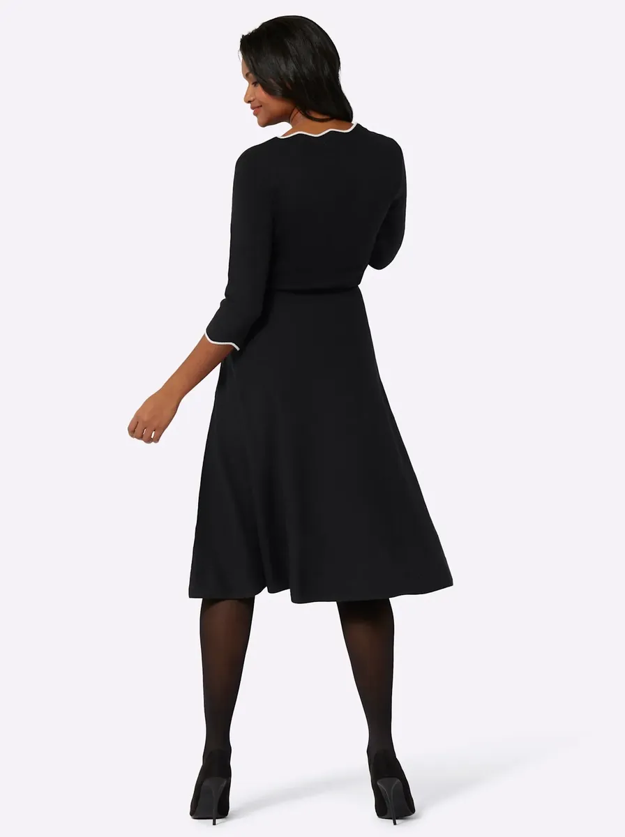 Мягко струящееся трикотажное платье элегантной тонкой вязки. Волнистые контрастные цветные края на вырезе-лодочке и на рукавах 3/4 с оборкой. Шов на талии подчеркивает женственный силуэт. Юбка привлекательного А-образного силуэта. Аккуратно связала по форме. 45% вискоза, 35% полиамид, 20% полиэстер. Машинная стирка.